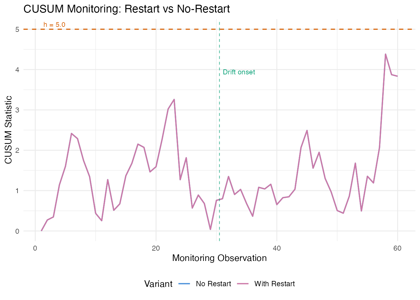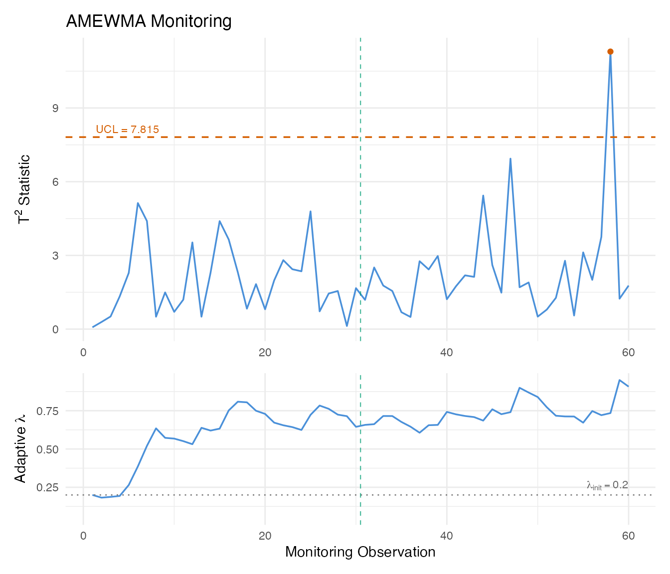 The adaptive trace reveals the AMEWMA’s self-tuning behavior. During the in-control period (observations 1–30), remains near its initial value. As the drift develops, adjusts to balance sensitivity and responsiveness. This adaptivity means you do not need to tune for a specific shift magnitude – the chart handles both small and large shifts.