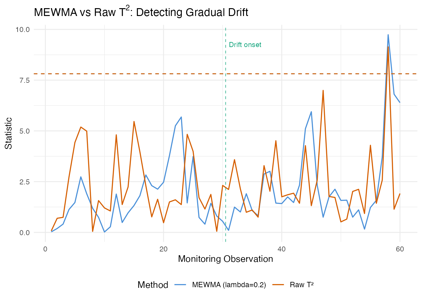 labs(title = expression("MEWMA vs Raw T"^2 * ": Detecting Gradual Drift"),