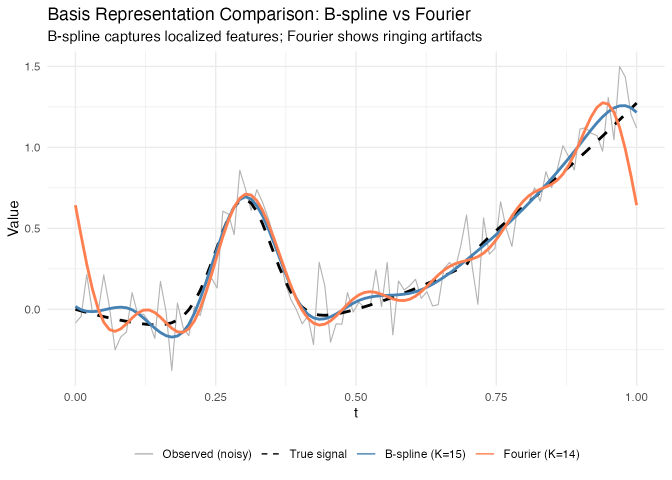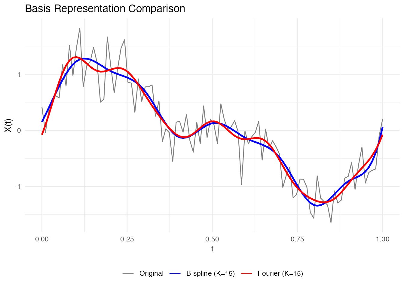 labs(x = "t", y = "X(t)", title = "Basis Representation Comparison") +