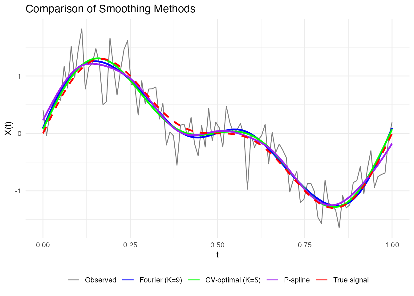 labs(x = "t", y = "X(t)", title = "Comparison of Smoothing Methods", color = NULL) +