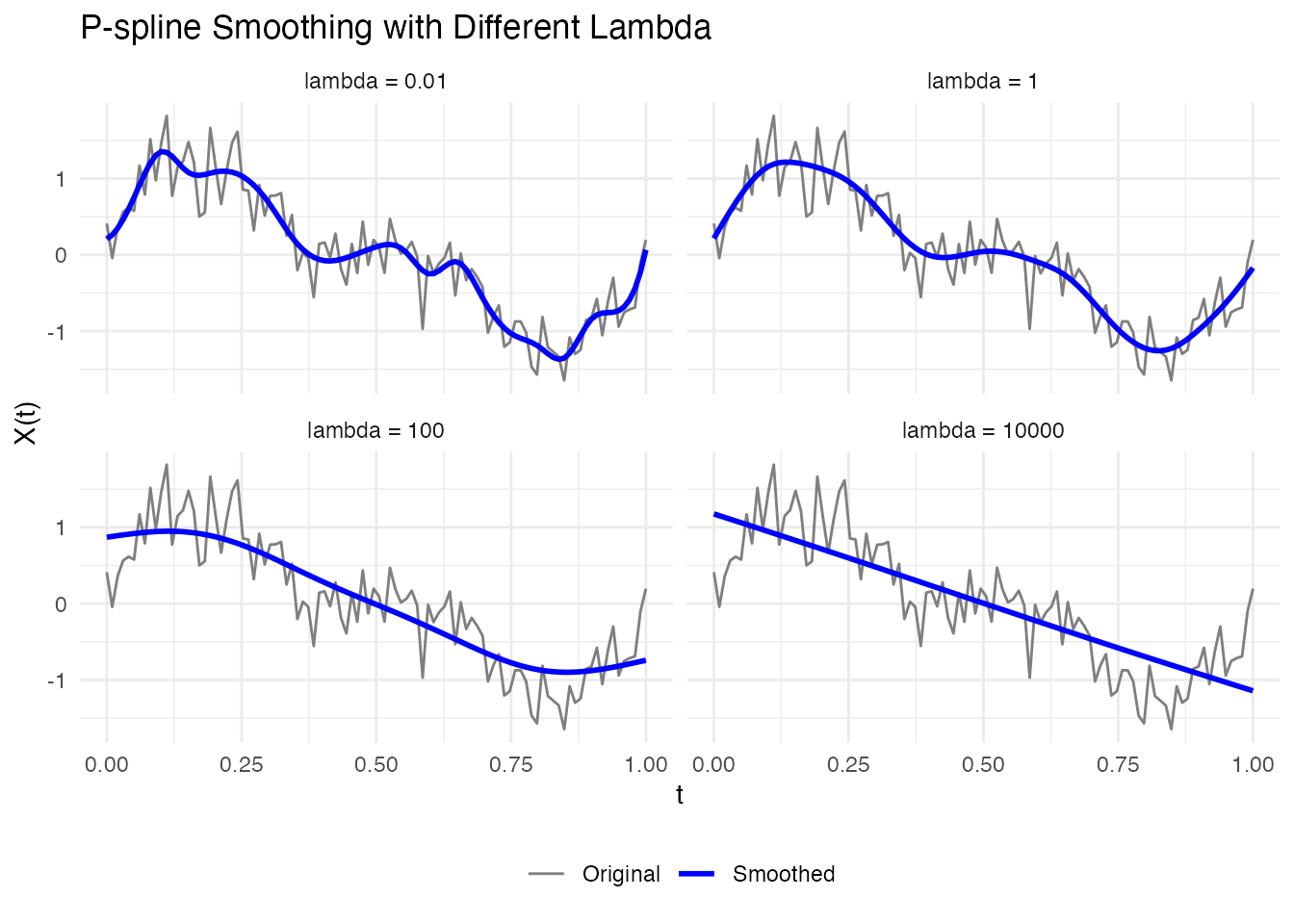 labs(x = "t", y = "X(t)", title = "P-spline Smoothing with Different Lambda") +