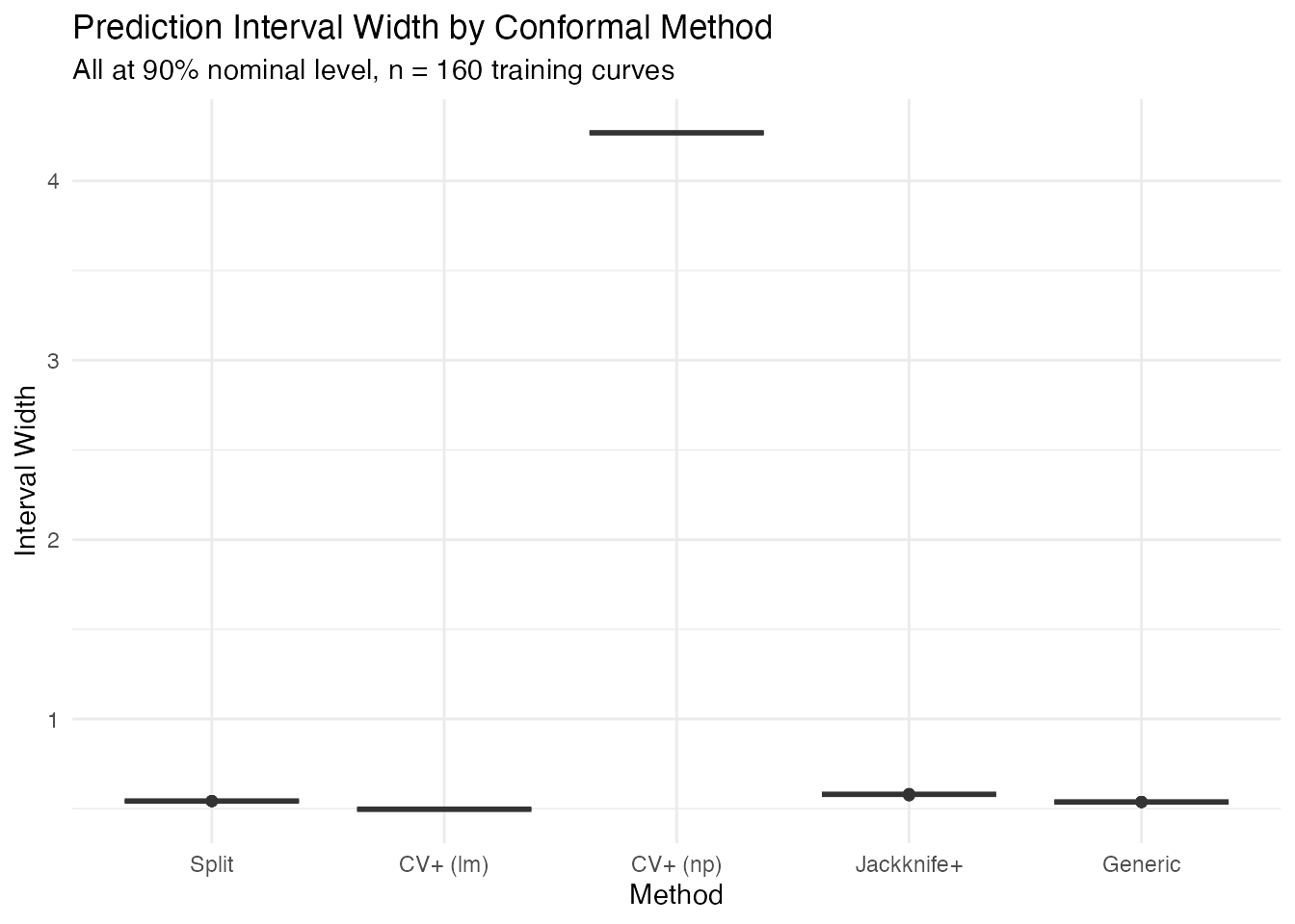 cal.fraction = 0.25and , you get 25 calibration points — sufficient for most cases. - CV+: effective with . All data contributes to both training and calibration.