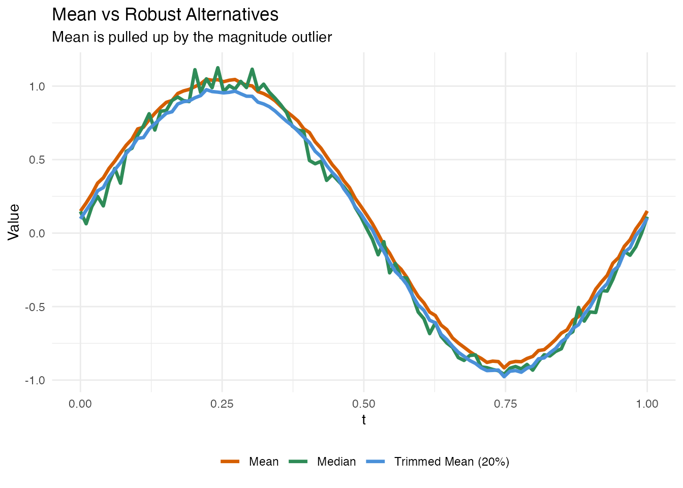 - Robust summary statistics — the functional median (deepest curve) and trimmed mean are resistant to outliers