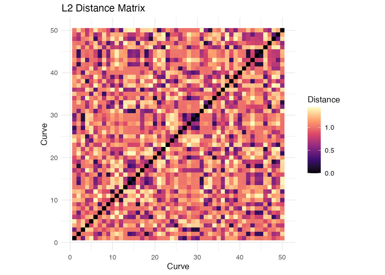 labs(x = "Curve", y = "Curve", title = "L2 Distance Matrix") +