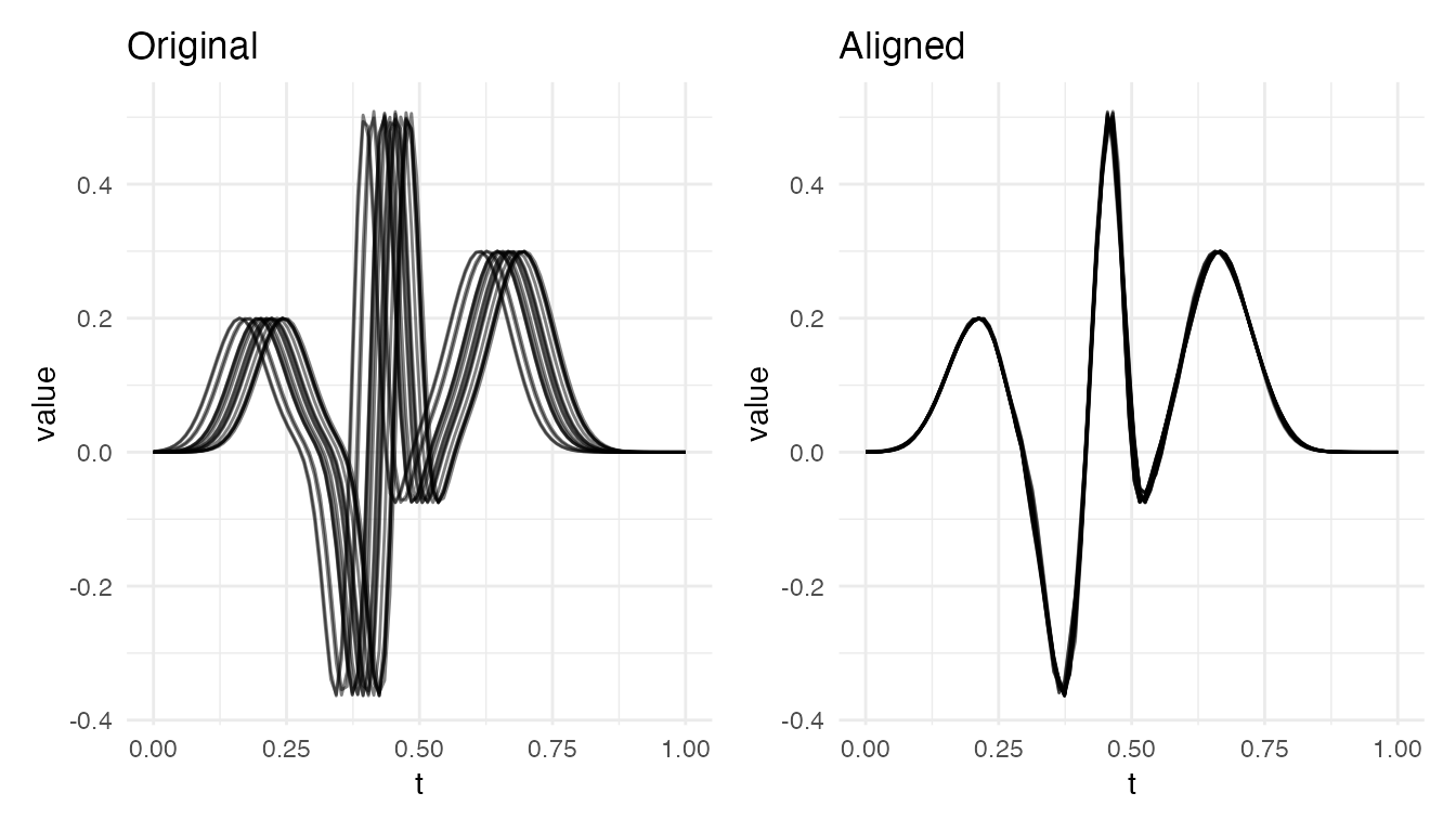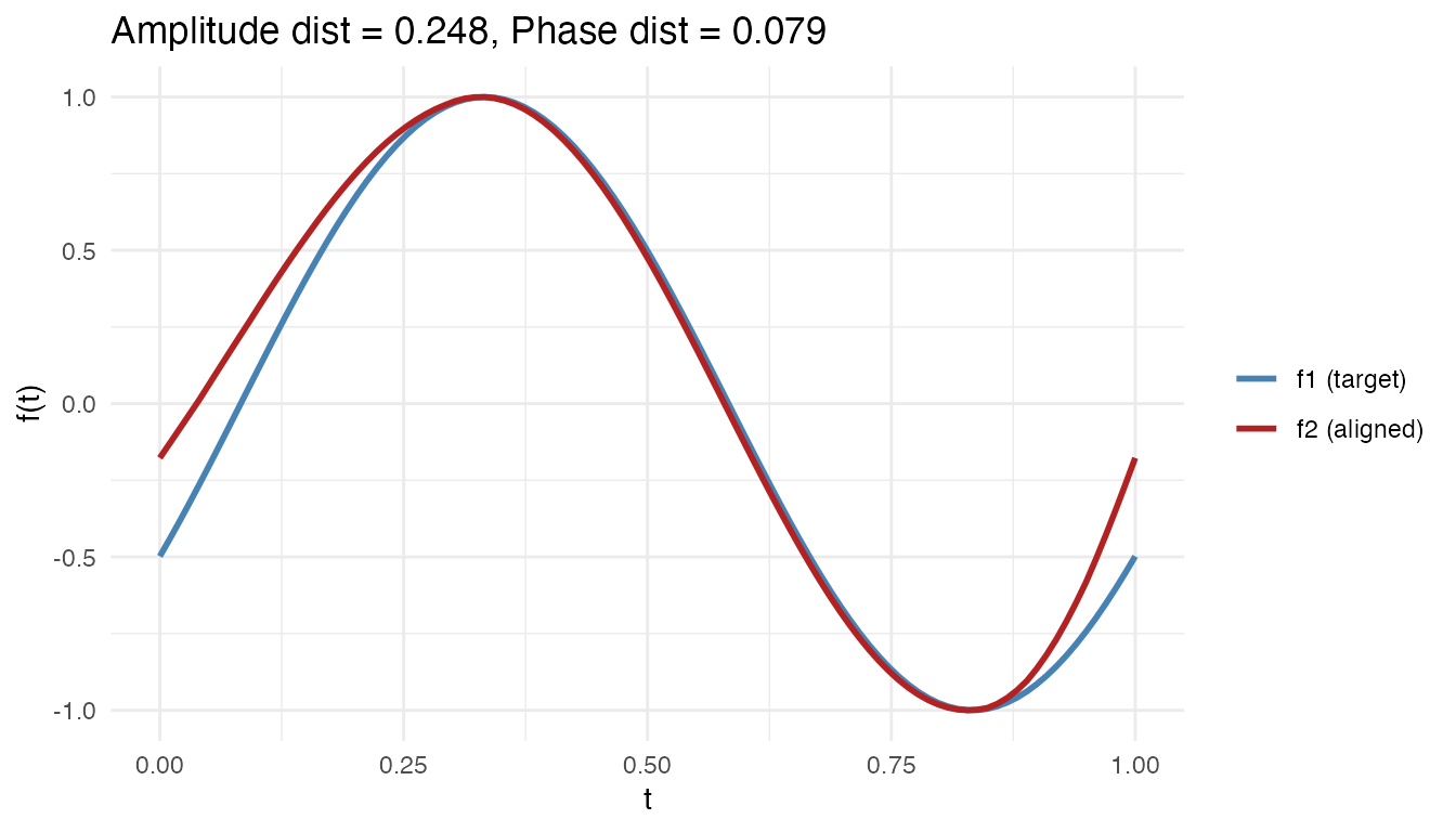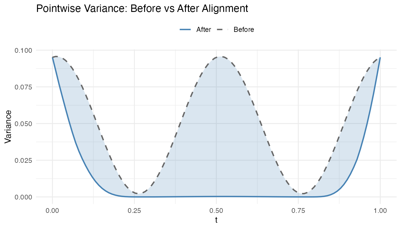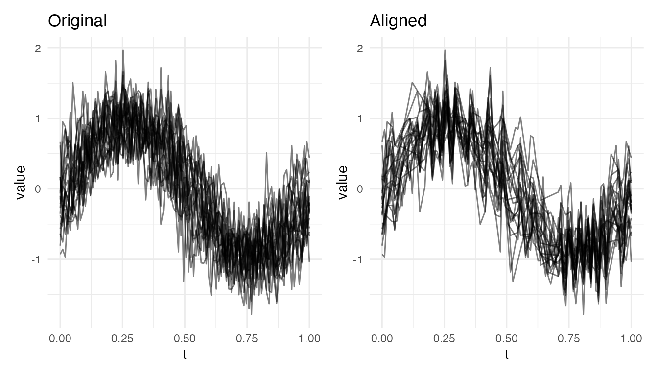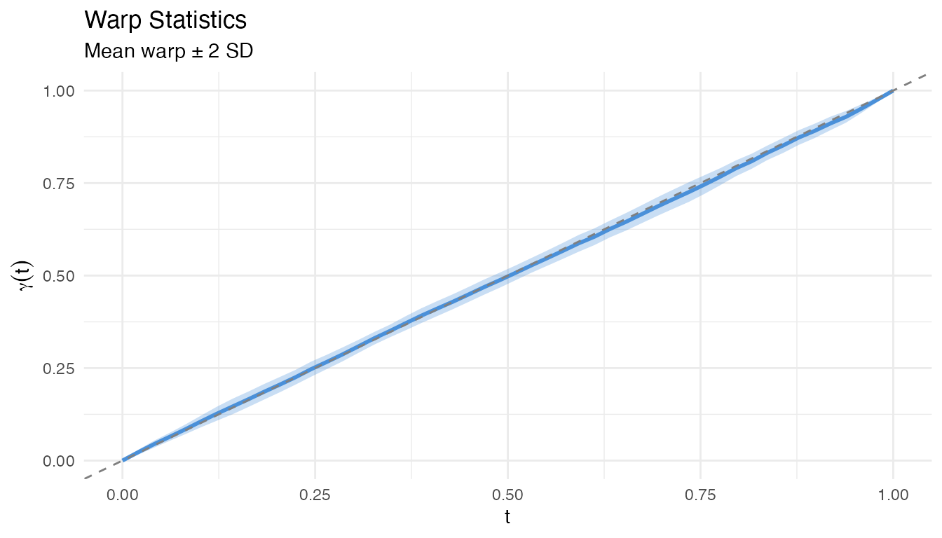 #> Max warp deviation from identity: 0This is the correct behavior: amplitude differences should not produce warping. However, when both amplitude and phase variability are present, the phase correction may be partial – alignment focuses on phase and leaves amplitude untouched.