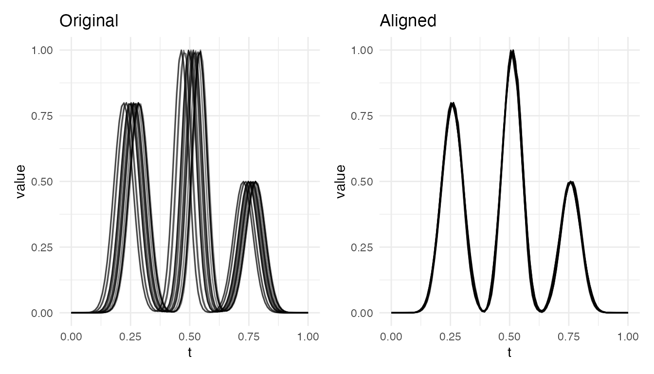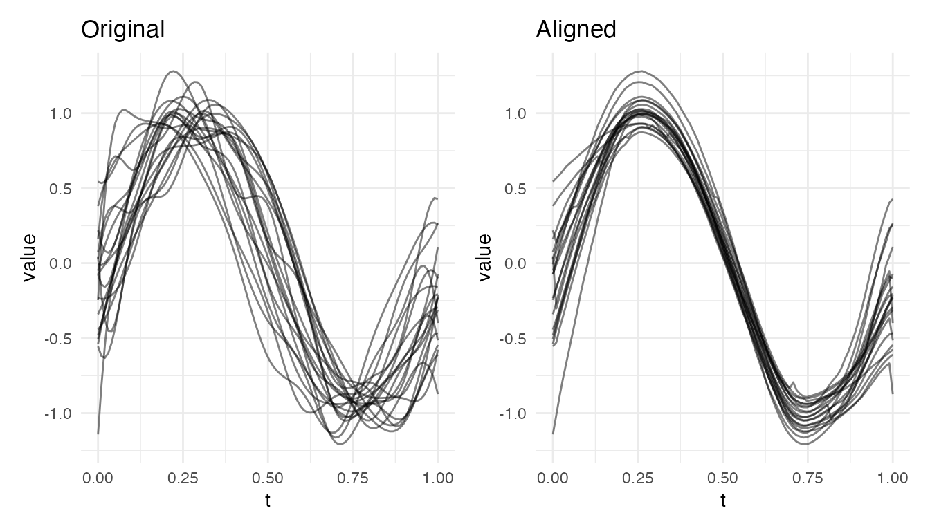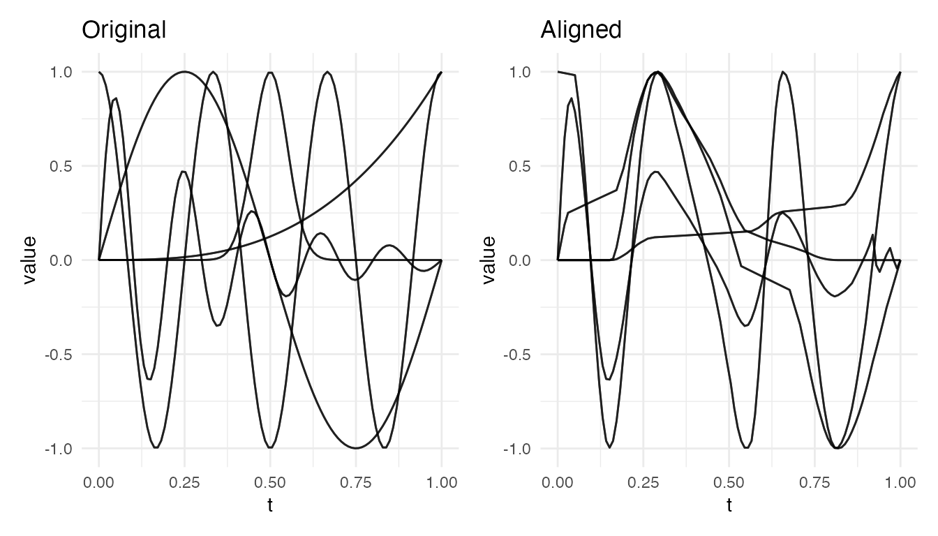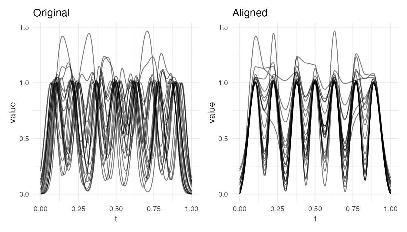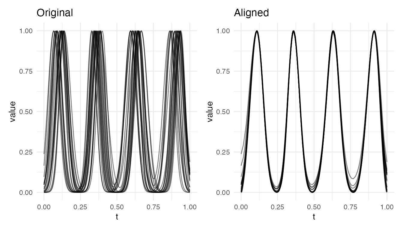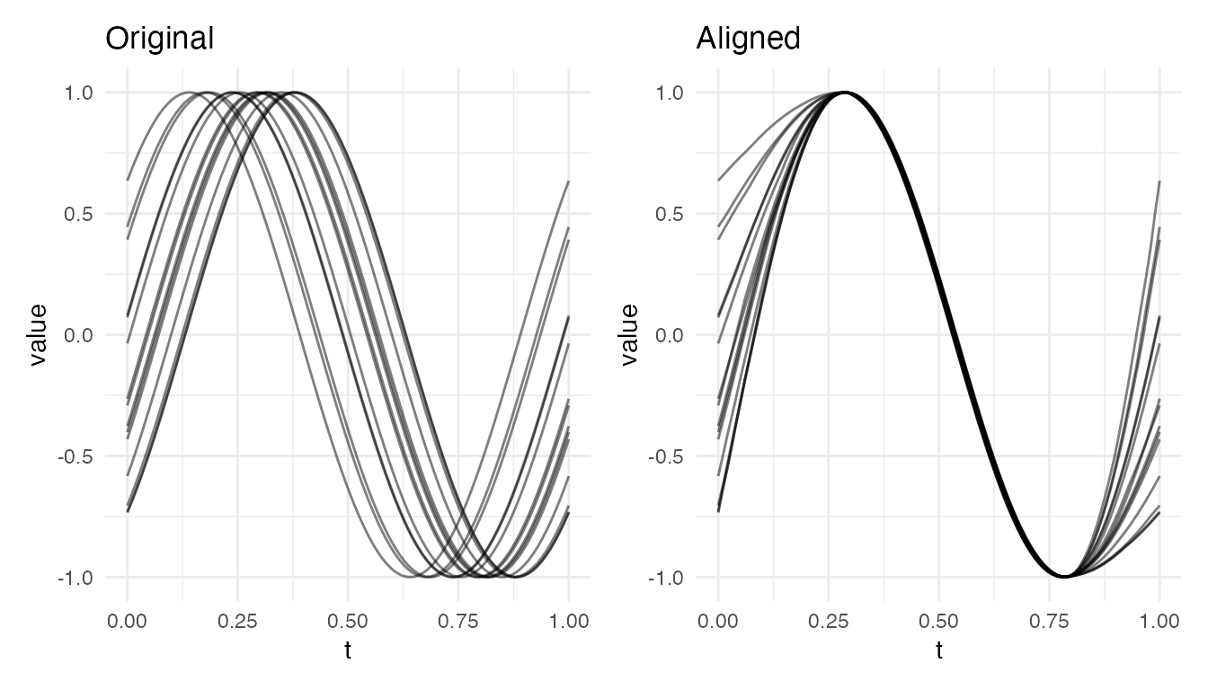 #> Max warp deviation from identity: 0This is the correct behavior: amplitude differences should not produce warping. However, when both amplitude and phase variability are present, the phase correction may be partial – alignment focuses on phase and leaves amplitude untouched.