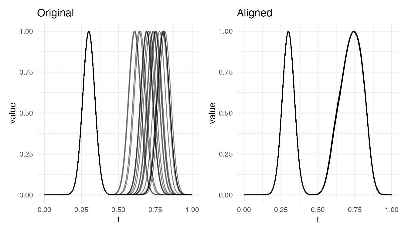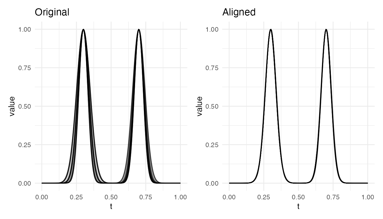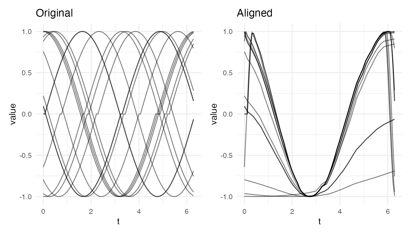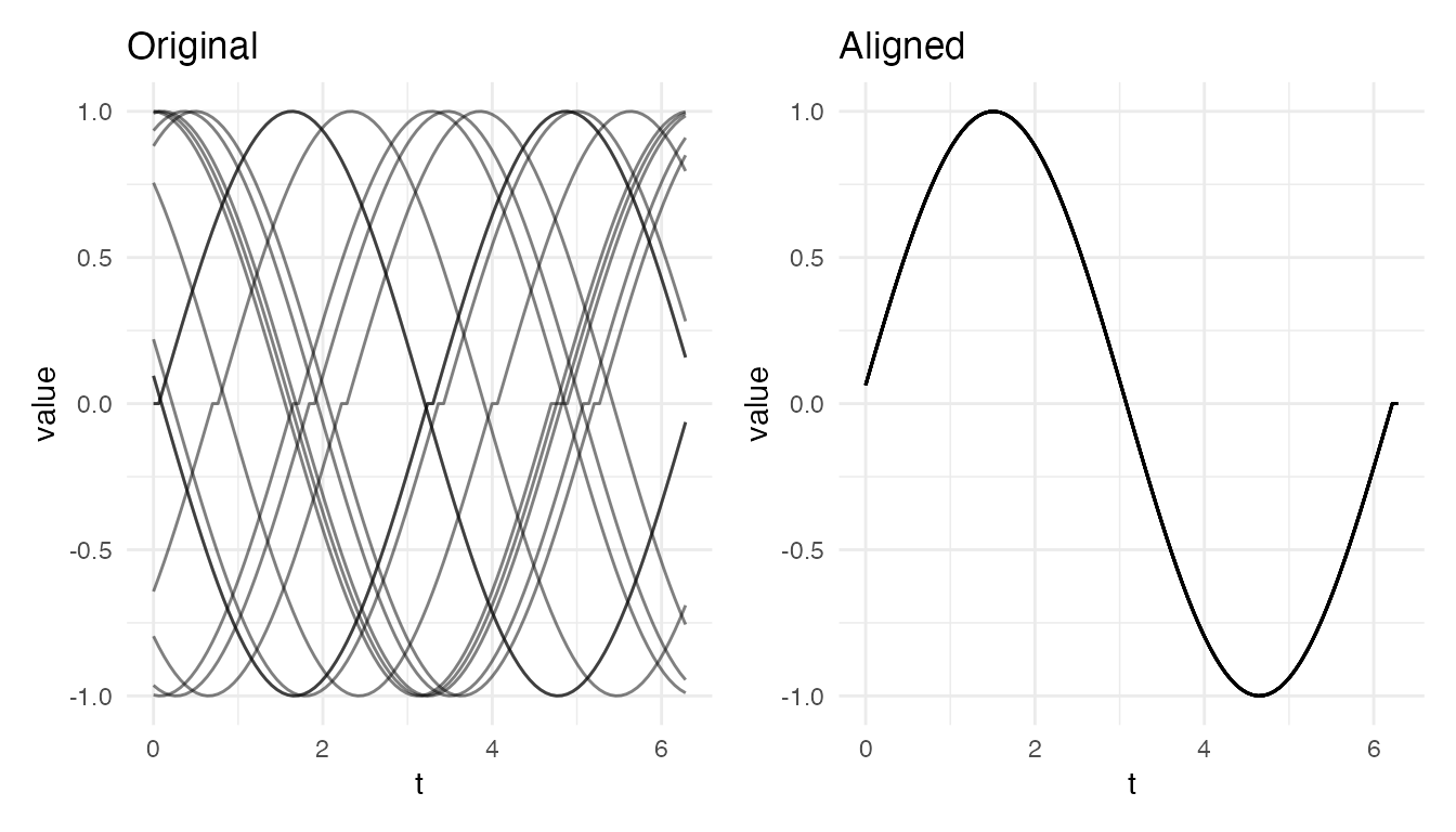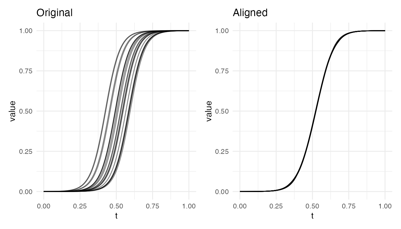 #> Max warp deviation from identity: 0This is the correct behavior: amplitude differences should not produce warping. However, when both amplitude and phase variability are present, the phase correction may be partial – alignment focuses on phase and leaves amplitude untouched.