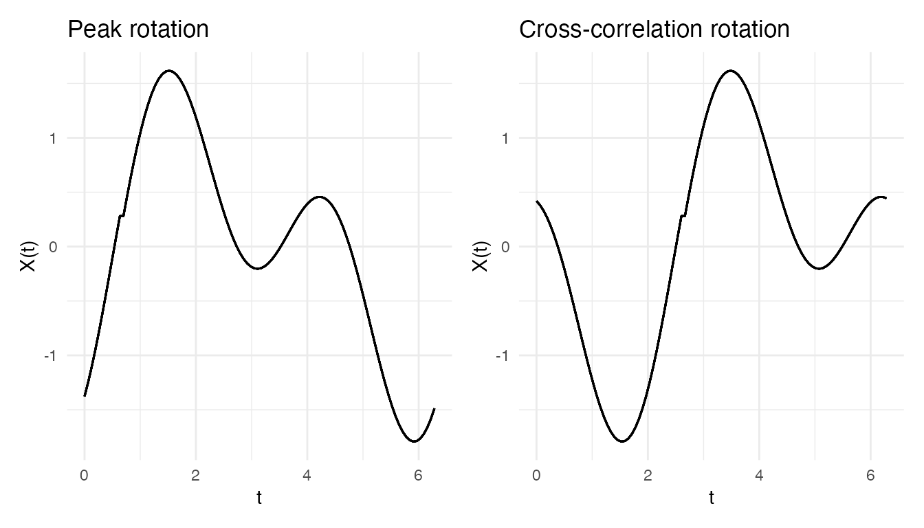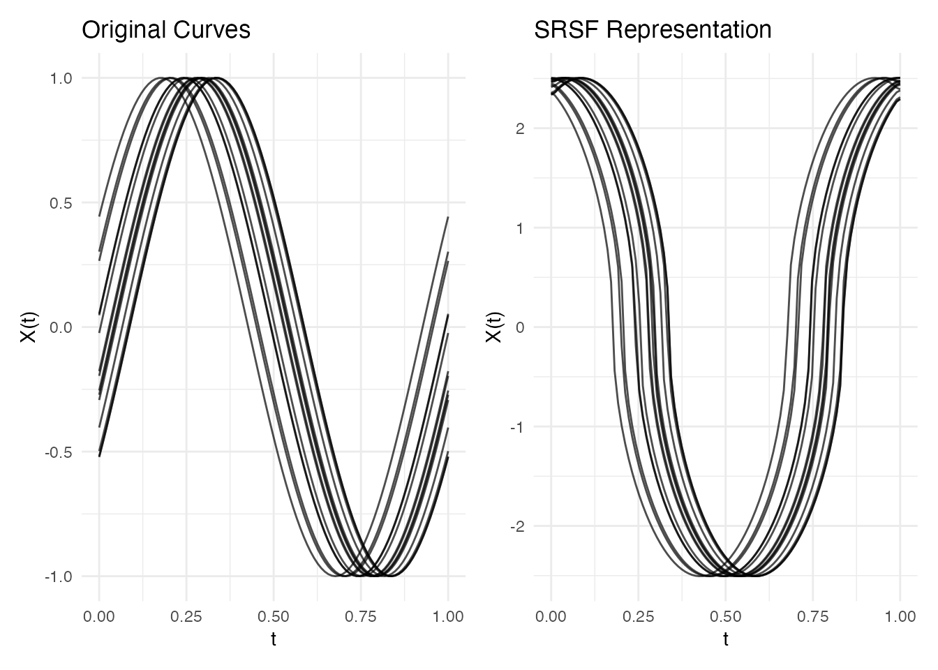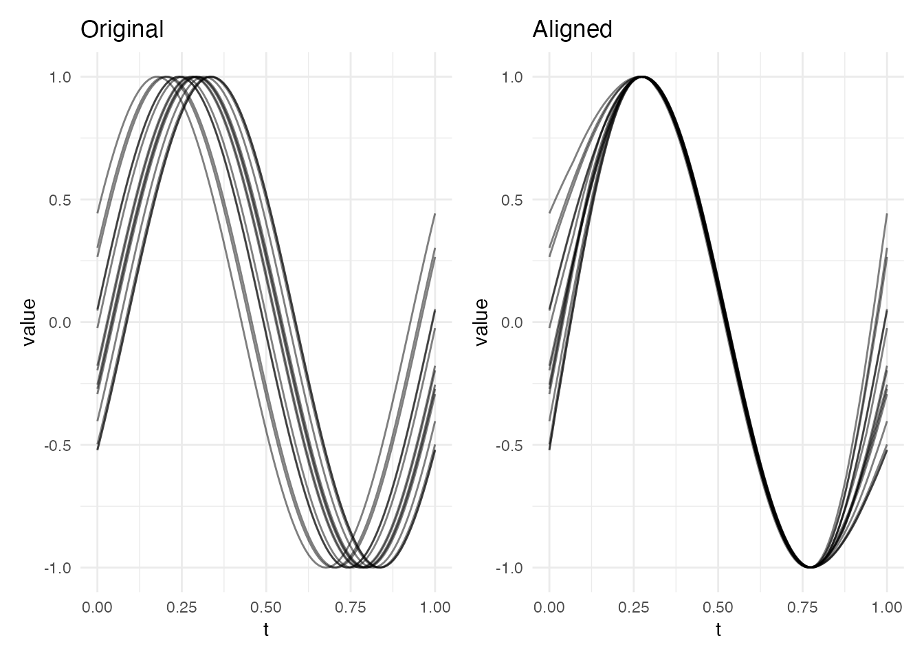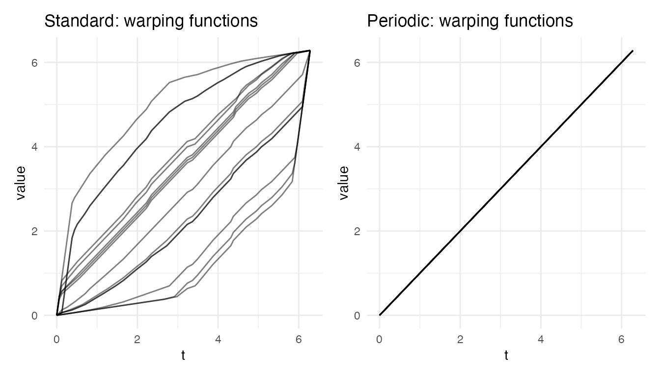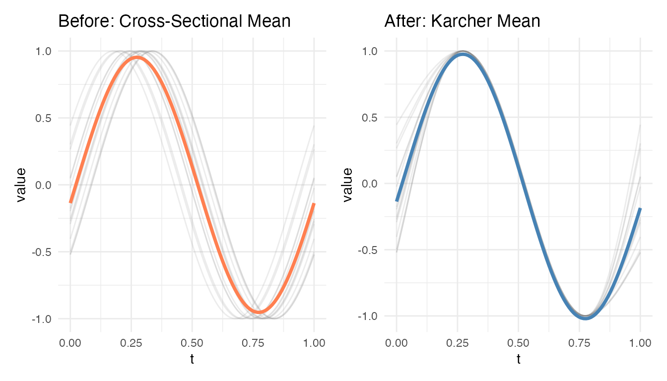 #> Max warp deviation from identity: 0This is the correct behavior: amplitude differences should not produce warping. However, when both amplitude and phase variability are present, the phase correction may be partial – alignment focuses on phase and leaves amplitude untouched.