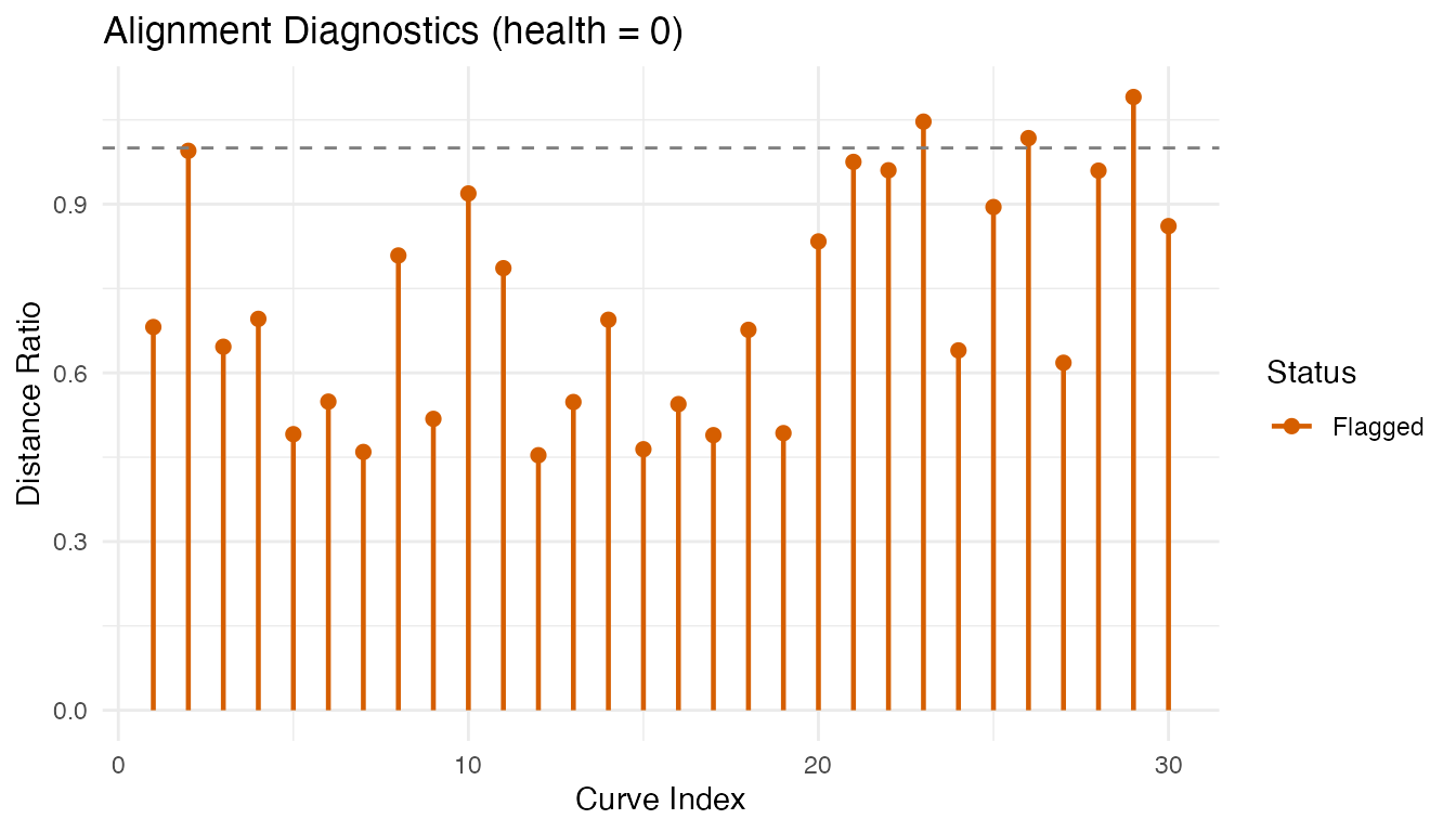 The health score (fraction of non-flagged curves) provides a quick summary. Flagged curves may need manual inspection or different alignment parameters.