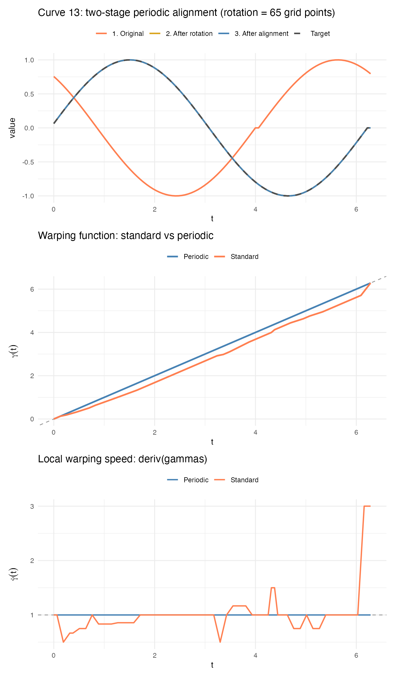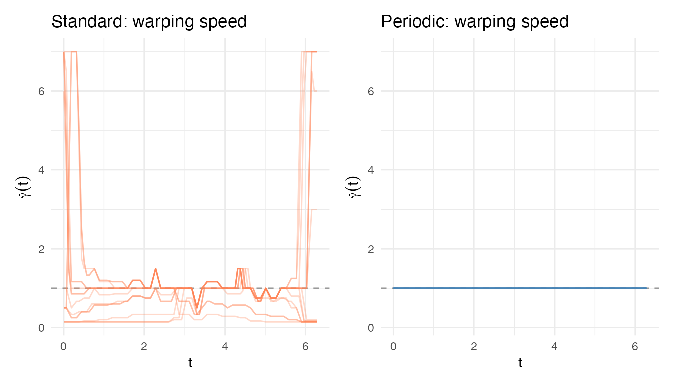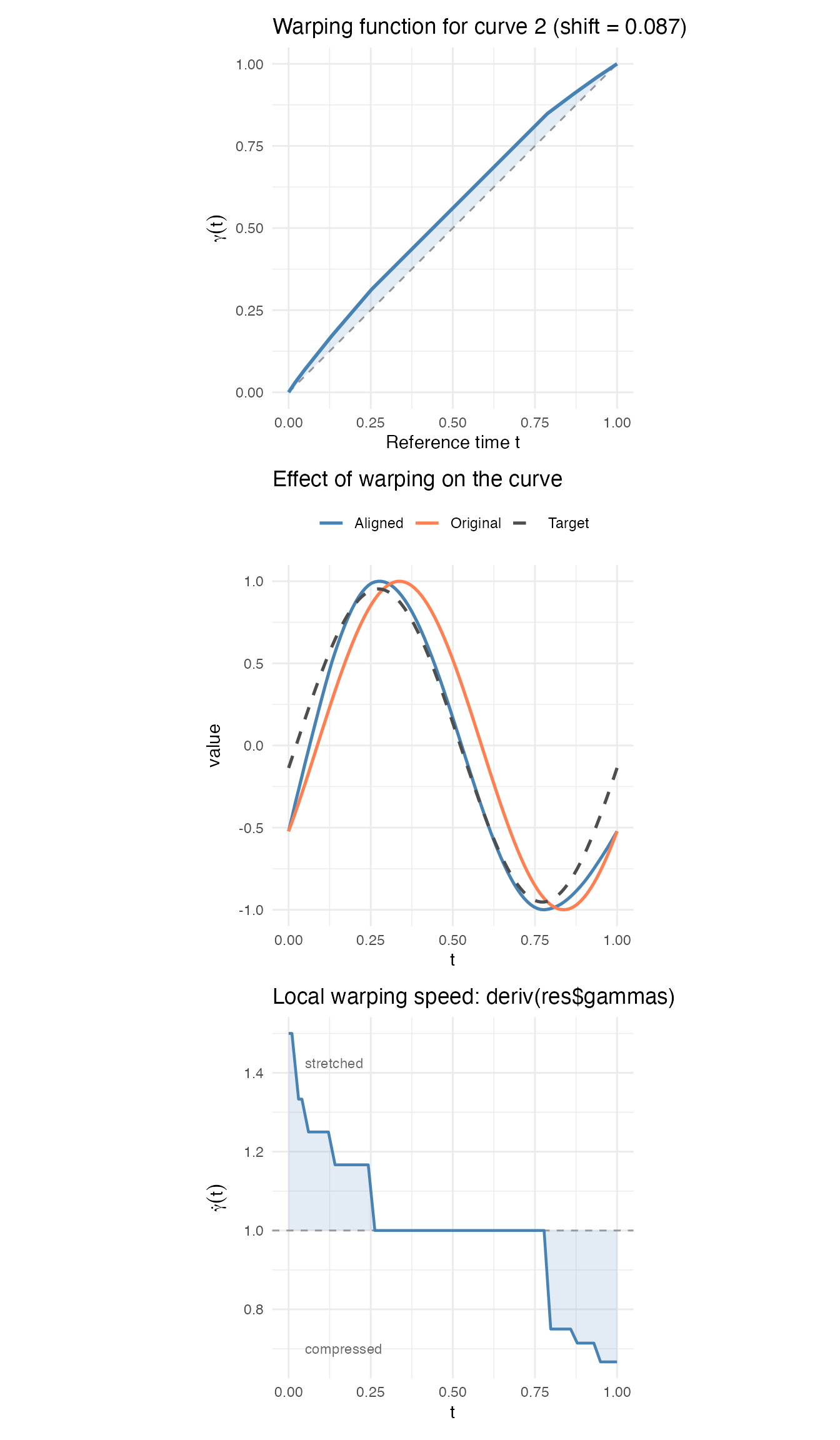 deriv(res$gammas). Since the warping functions arefdataobjects,deriv()returns anfdataof derivatives. Where , time is being stretched; where , time is compressed. The regions of fastest change correspond to where the original curve’s features were most offset from the target.