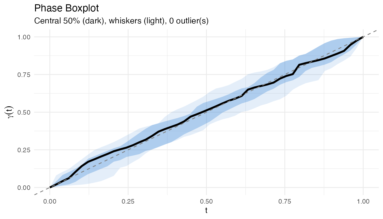 Phase boxplots provide a functional boxplot of the warping functions, identifying outlier warps: