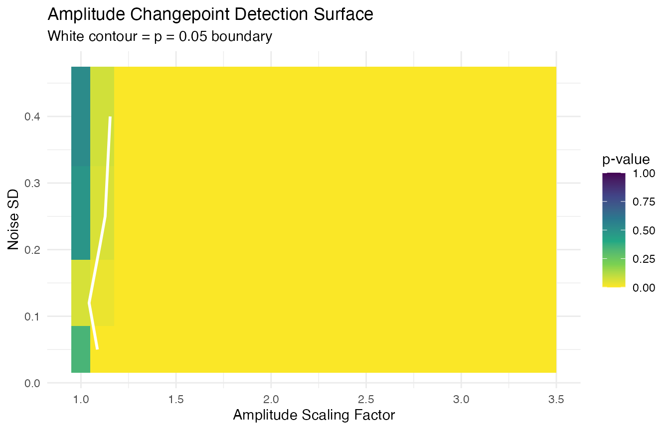 - High noise (): only dramatic changes (2x+ amplitude) are reliably detected.