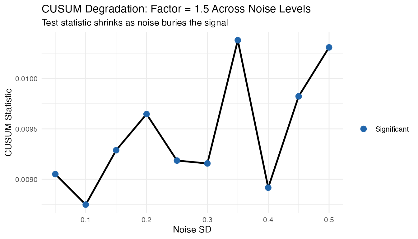 seedfor reproducibility - Compare CUSUM magnitudes across test types to diagnose the nature of a detected change
