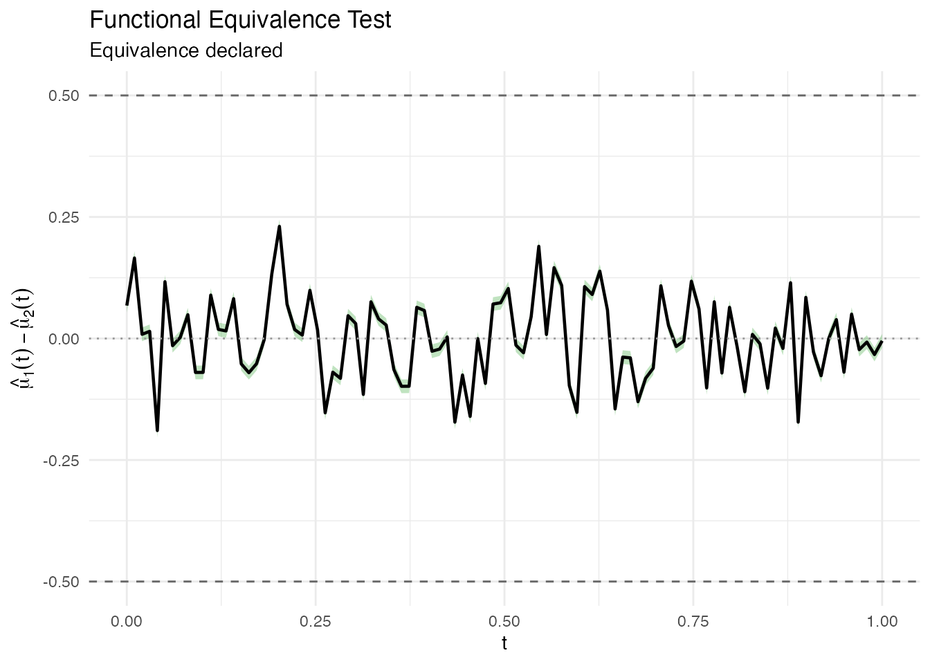 #> Decision: Reject H0 -- equivalence declaredThe plot shows the mean difference curve (black), the simultaneous confidence band (green = equivalence declared, red = not declared), and the equivalence margins (dashed lines at ).