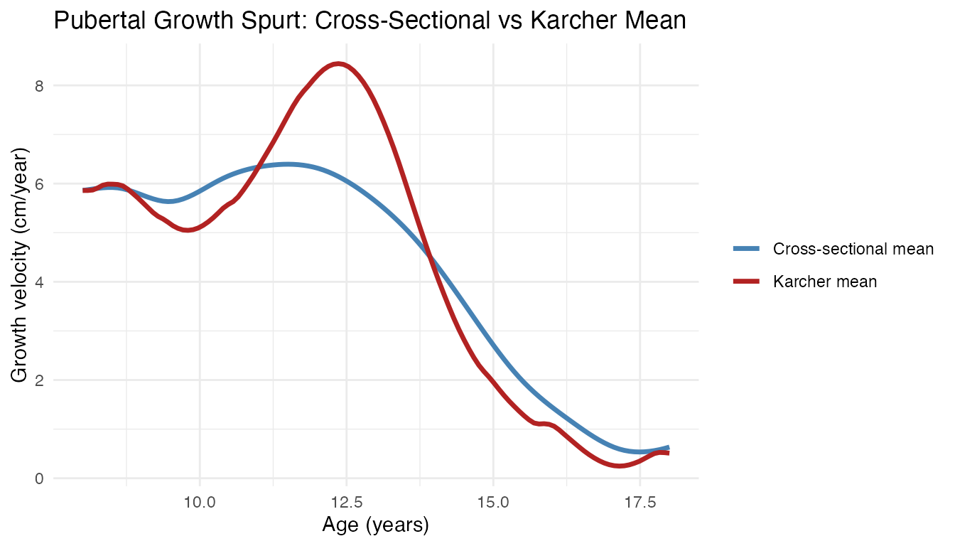 As a bonus, the Karcher mean also recovers a de-blurred population average. The cross-sectional mean is attenuated because children’s growth spurts are averaged at mismatched ages; the Karcher mean recovers the true peak amplitude: