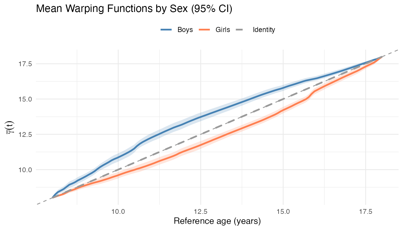 Girls’ mean warping sits below the identity (the growth spurt features occur at younger ages), while boys’ sits above. The vertical gap between the two curves represents the timing difference at each reference age.