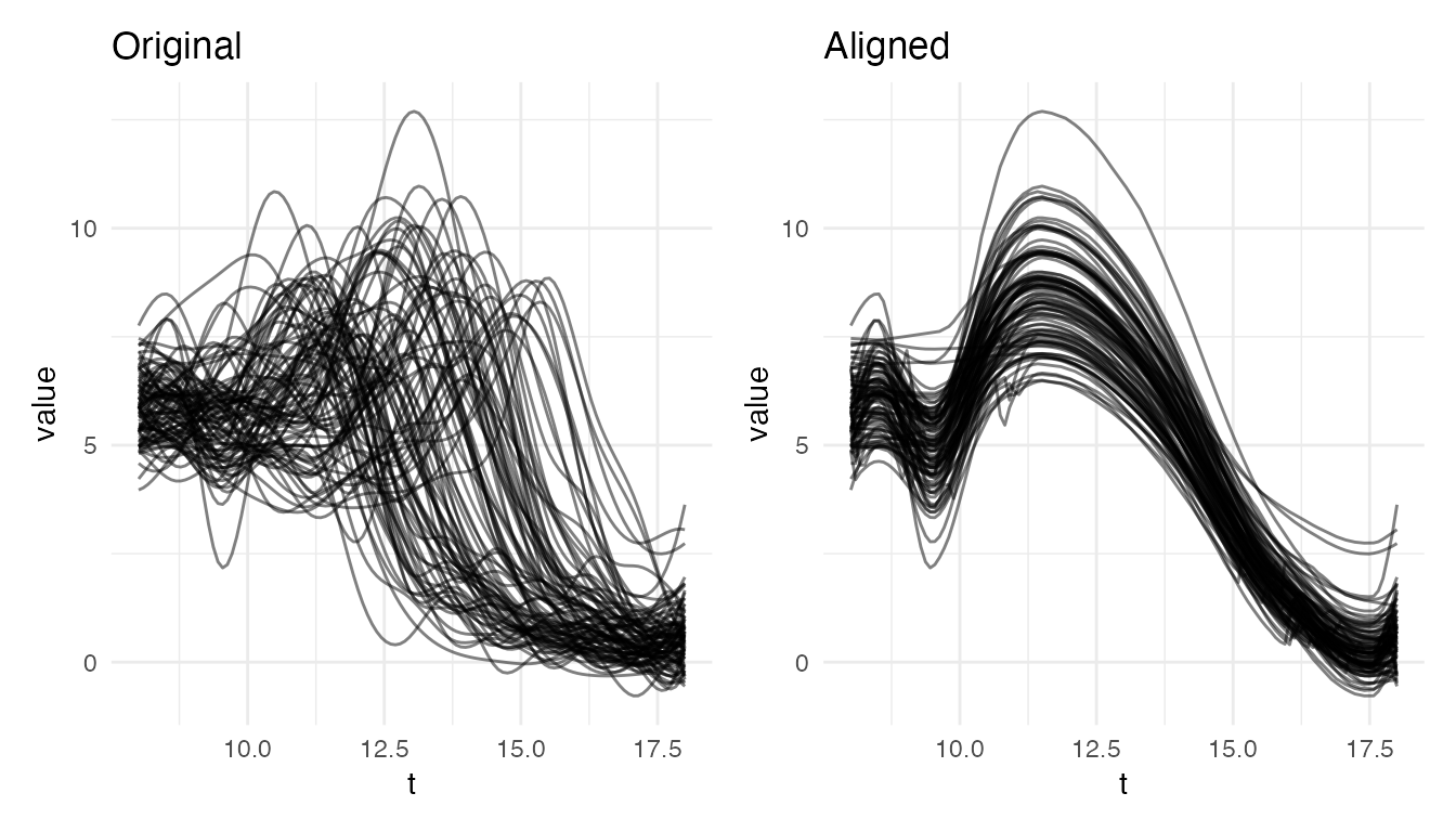 #> After alignment: PC1 = 57.6 %, PC2 = 32.3 %, PC3 = 10.1 %Before alignment, phase variability spreads across multiple PCs. After alignment, the remaining (amplitude) variability is more efficiently captured by the first PC.