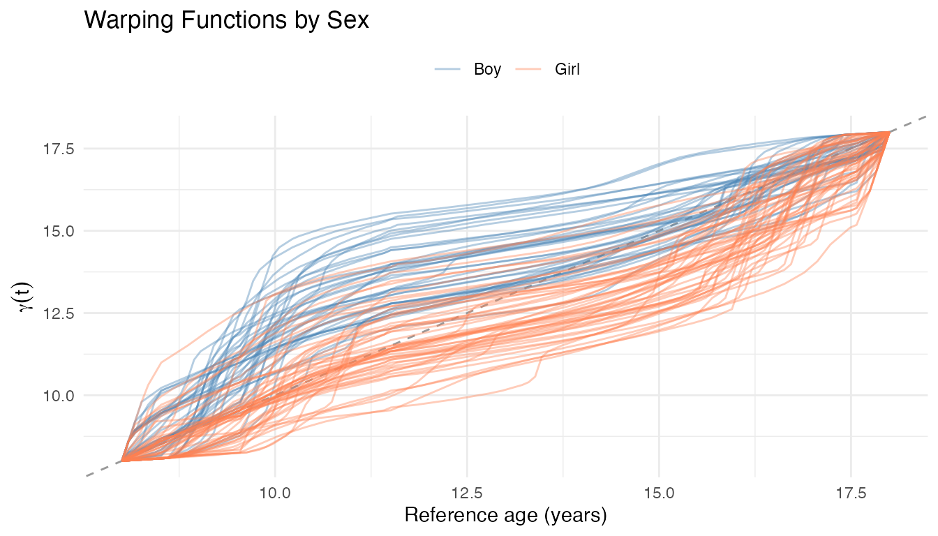 | FPCA on warpings | Identify main modes of timing variation | PC1 (83%) separates boys from girls; PC2 captures secondary timing structure |