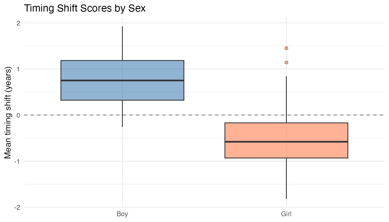 | Equivalence test | Test whether boys and girls differ in timing | Equivalence rejected at years — ~2 year gap confirmed with bootstrap CIs |