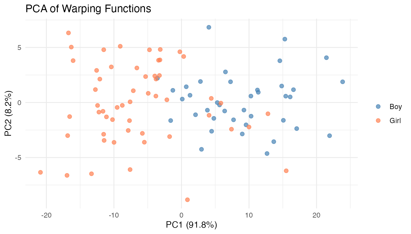 The PC1 score is almost perfectly correlated with the mean timing shift () and clearly separates boys from girls. PC2 captures a secondary mode of timing variation orthogonal to the early/late shift – its interpretation would require inspecting the eigenfunctions.