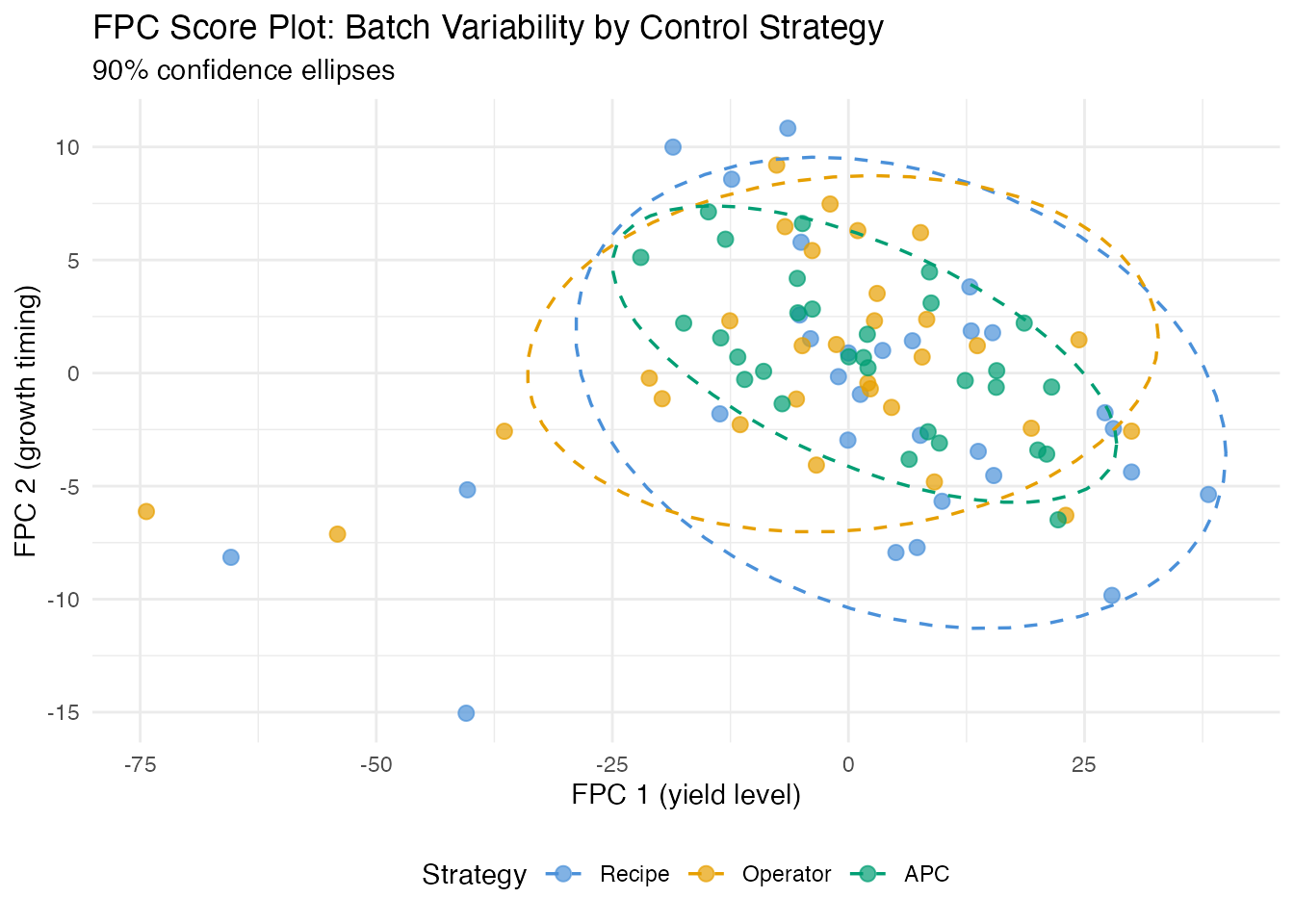 Control strategy differences are clear in real data. APC batches (Raman-guided) achieve the highest and most consistent penicillin concentrations, while recipe and operator-controlled batches show wider variability. The FPCA score plot visually separates the strategies.