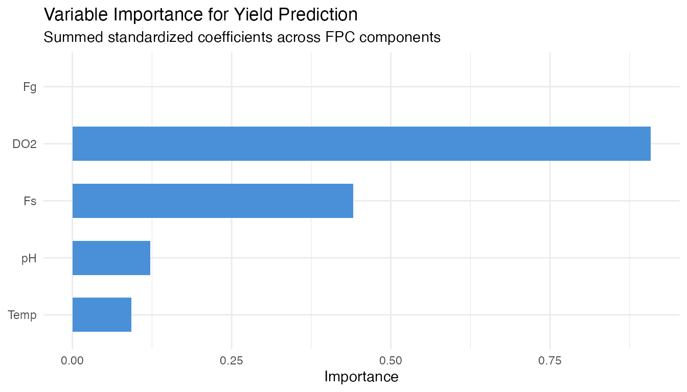 Dissolved oxygen is the strongest controllable yield driver among the five variables screened. The coefficient functions and importance ranking identify which variables matter most and when during the batch.