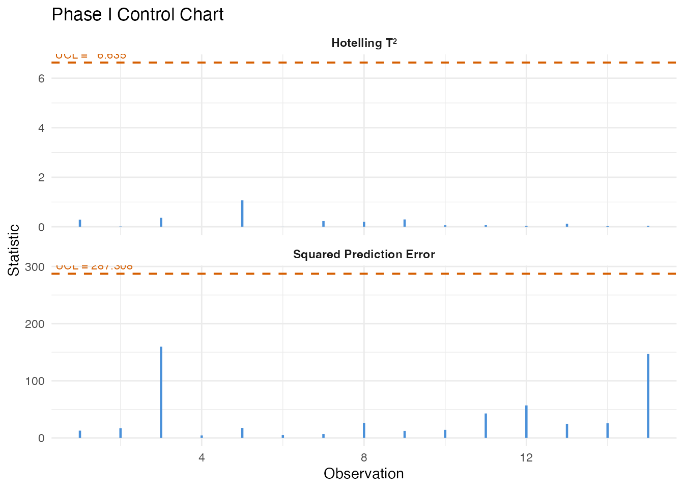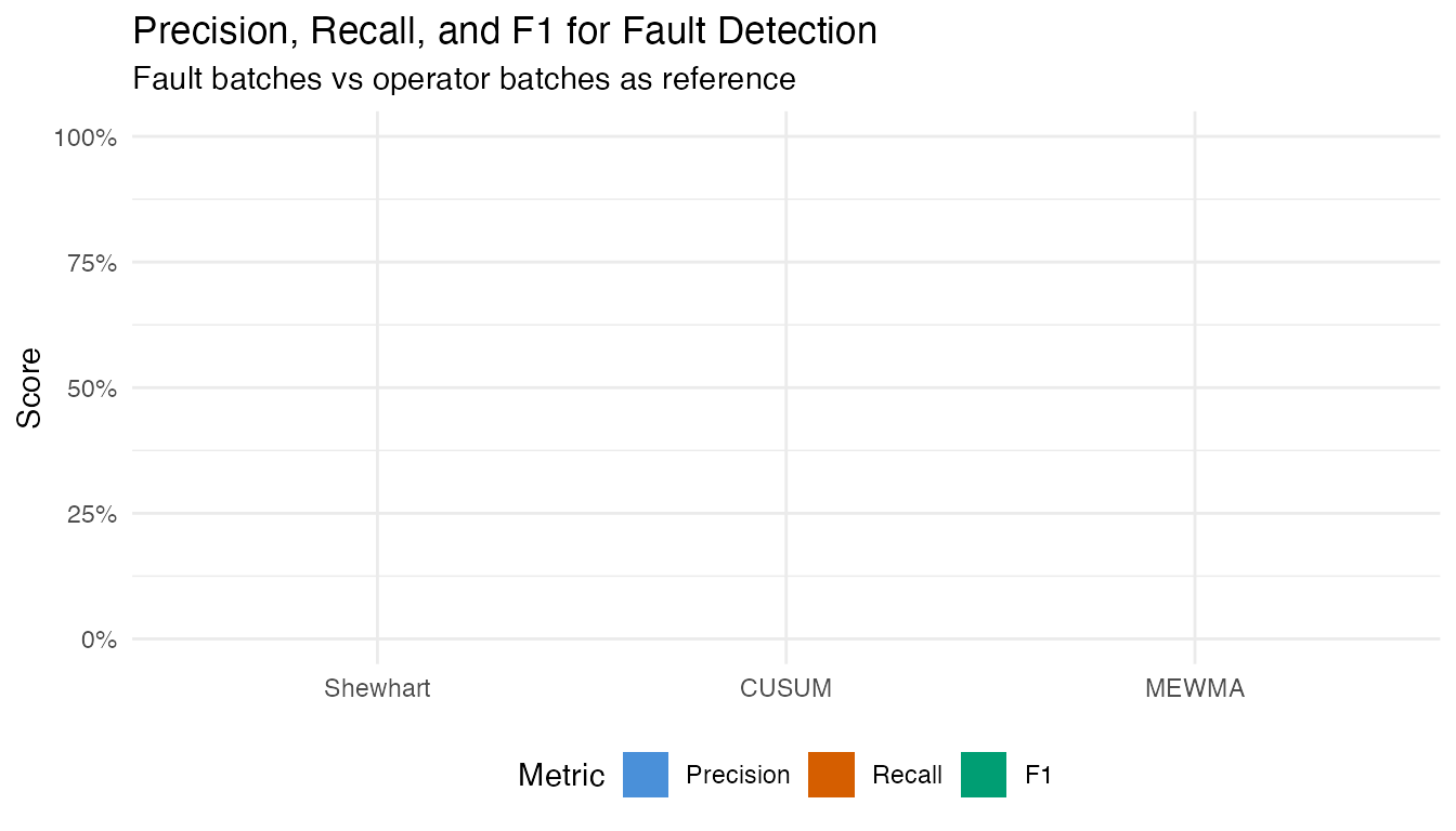 | 4. Process monitoring | Phase I from recipe batches, Phase II fault detection | T-squared chart + detection rates |
