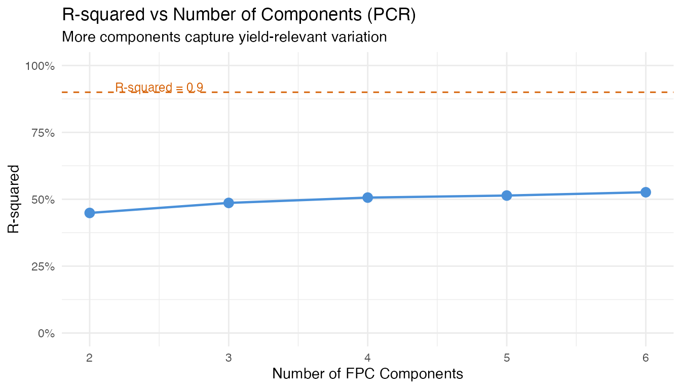 FDA provides interpretable summaries. FPCA captures the dominant modes of batch variation; coefficient functions show exactly when and where each variable drives yield prediction.