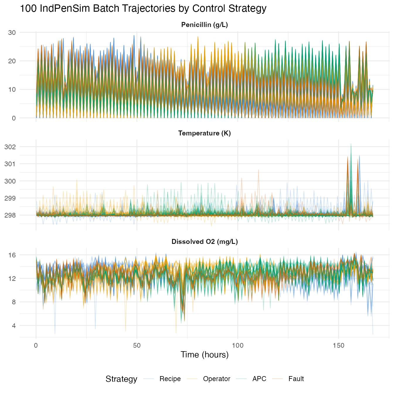 This article analyzes 100 batches of industrial-scale penicillin fermentation data from the IndPenSim simulator (Goldrick et al., 2015). Each batch produces time-series trajectories for temperature, dissolved oxygen, penicillin concentration, sugar feed rate, pH, and other process variables over 167-290 hours. Batches operate under three control strategies, and 10 batches contain intentional process faults.