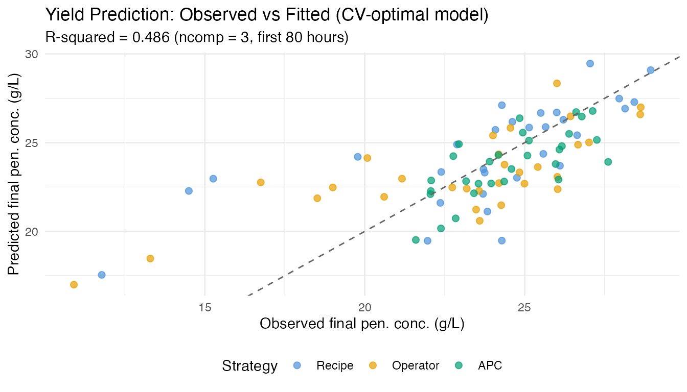 Early yield prediction is moderately successful. Using the first 80 hours of the penicillin trajectory to predict final concentration at harvest achieves R-squared ~0.5 – useful as an early warning but not a precise forecast. Note: total yield (kg, including harvested broth) is weakly correlated with final concentration (r=0.11) and harder to predict from trajectory shape alone.