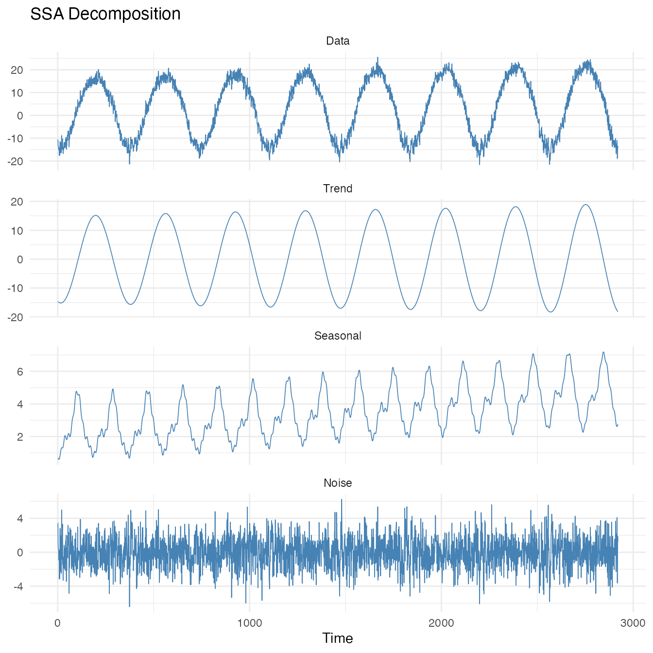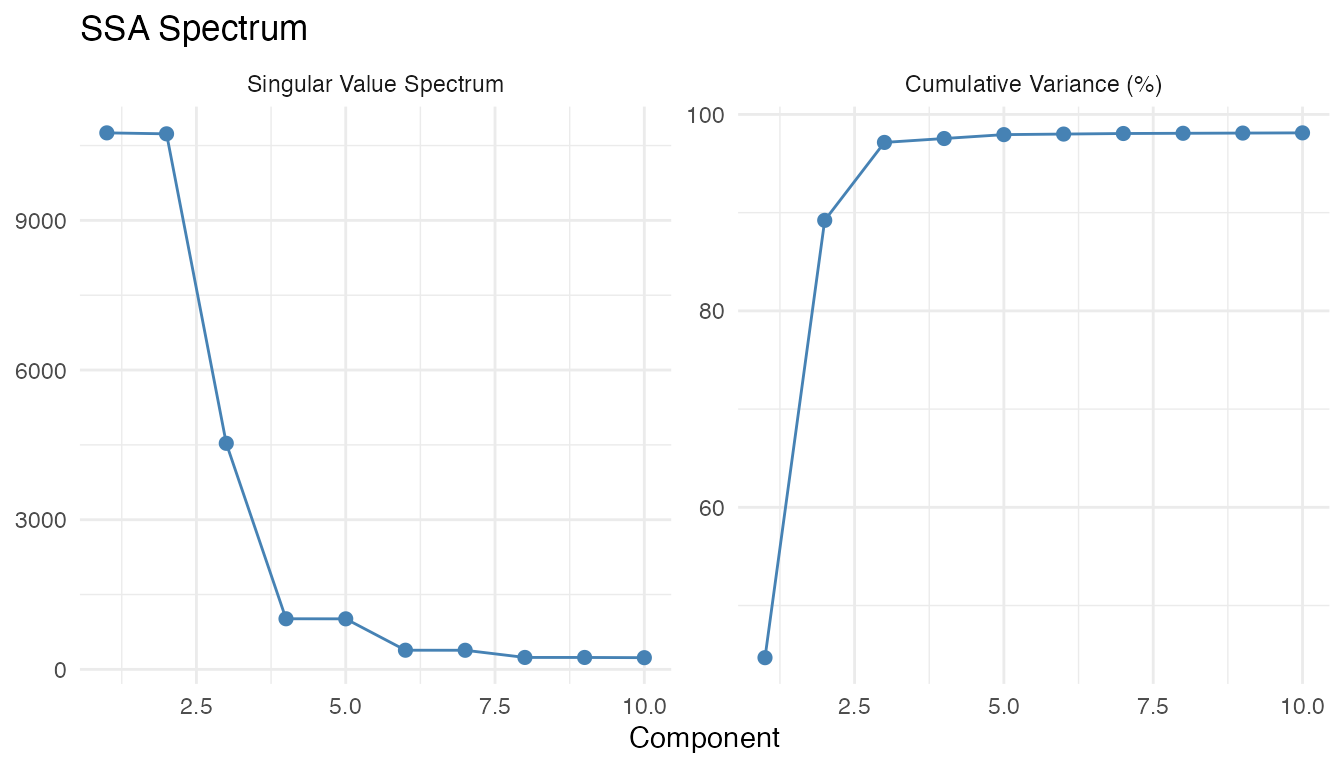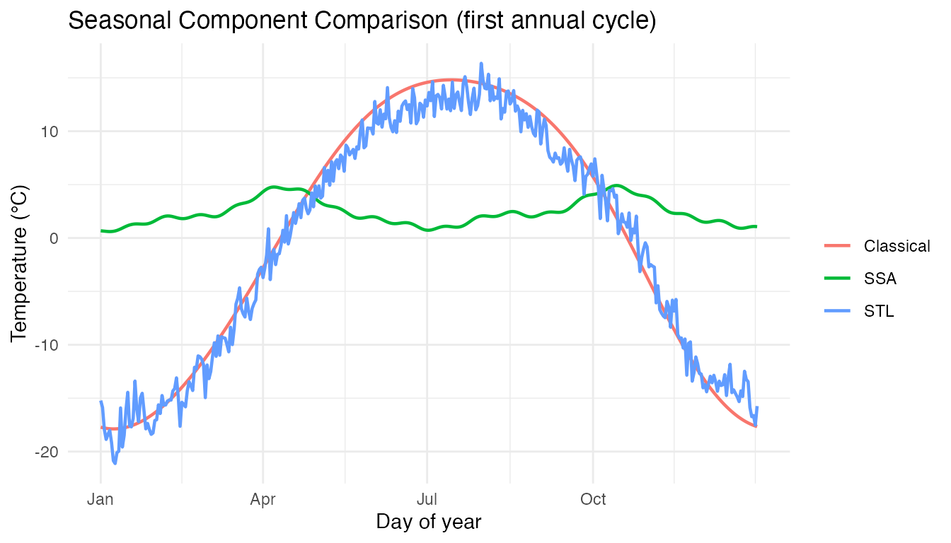 - SSA correctly assigns the dominant annual oscillation (89% variance) to the seasonal slot, with the warming trend extracted separately.
