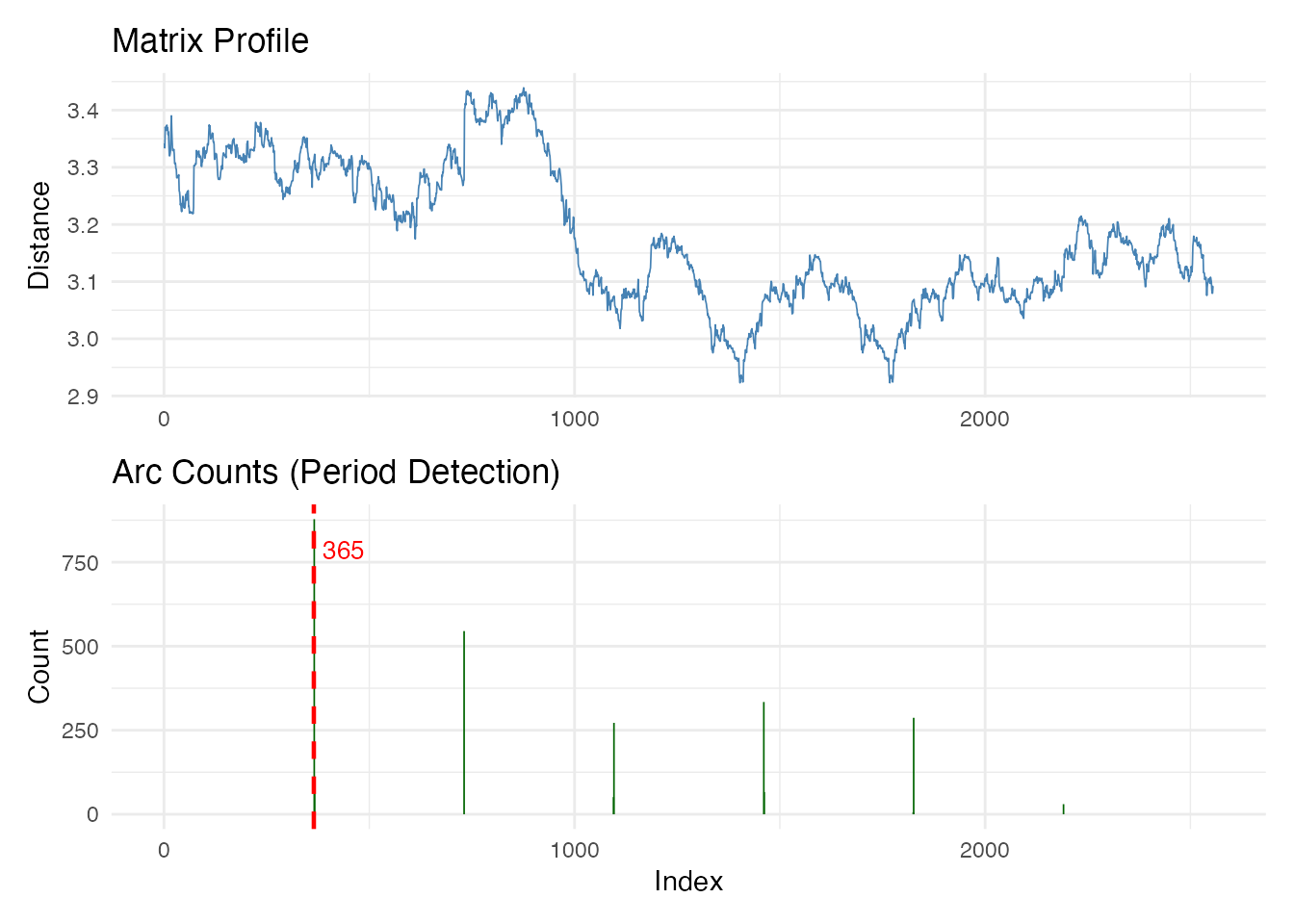 detect.periods()identifies the fundamental annual cycle and its harmonics (half-year, quarter-year), each with period, confidence, and strength — confirming the non-sinusoidal shape of the seasonal pattern. - Matrix Profile confirms the annual motif using non-parametric shape matching — robust even with year-to-year noise.