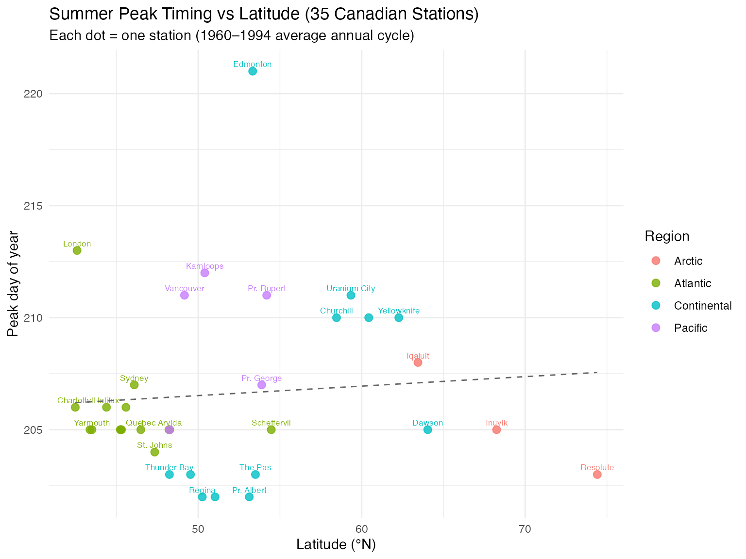 - Peak timing across all 35 stations shows the summer maximum occurs around day 200–210 (late July), with Pacific stations peaking slightly later. Peak temperature decreases strongly with latitude.
