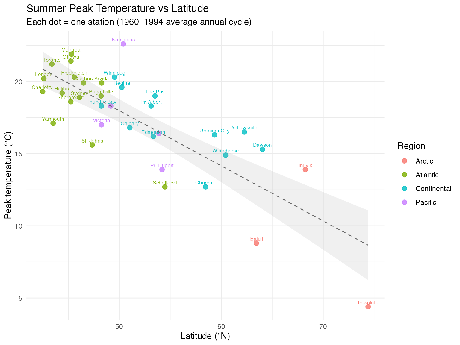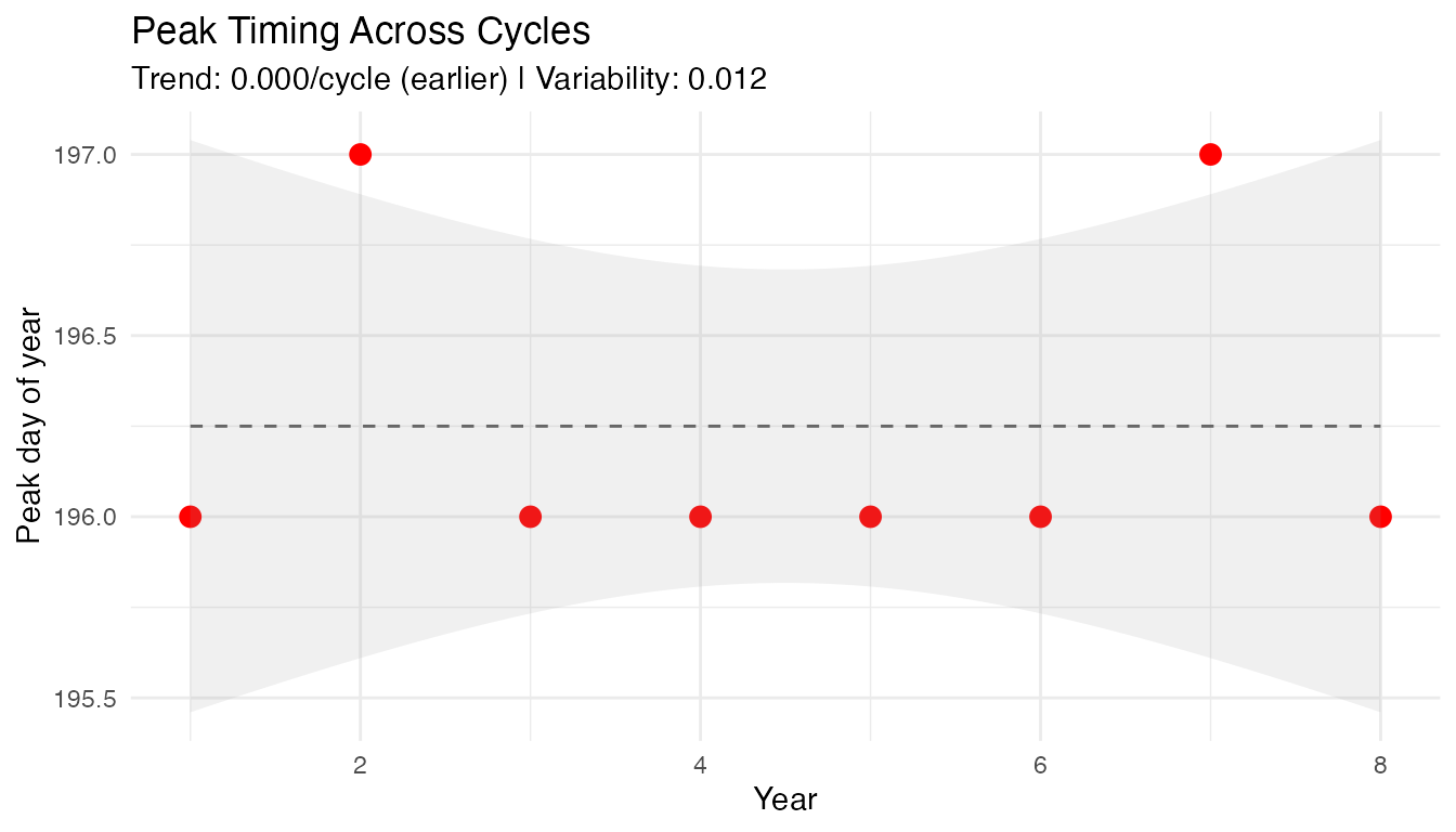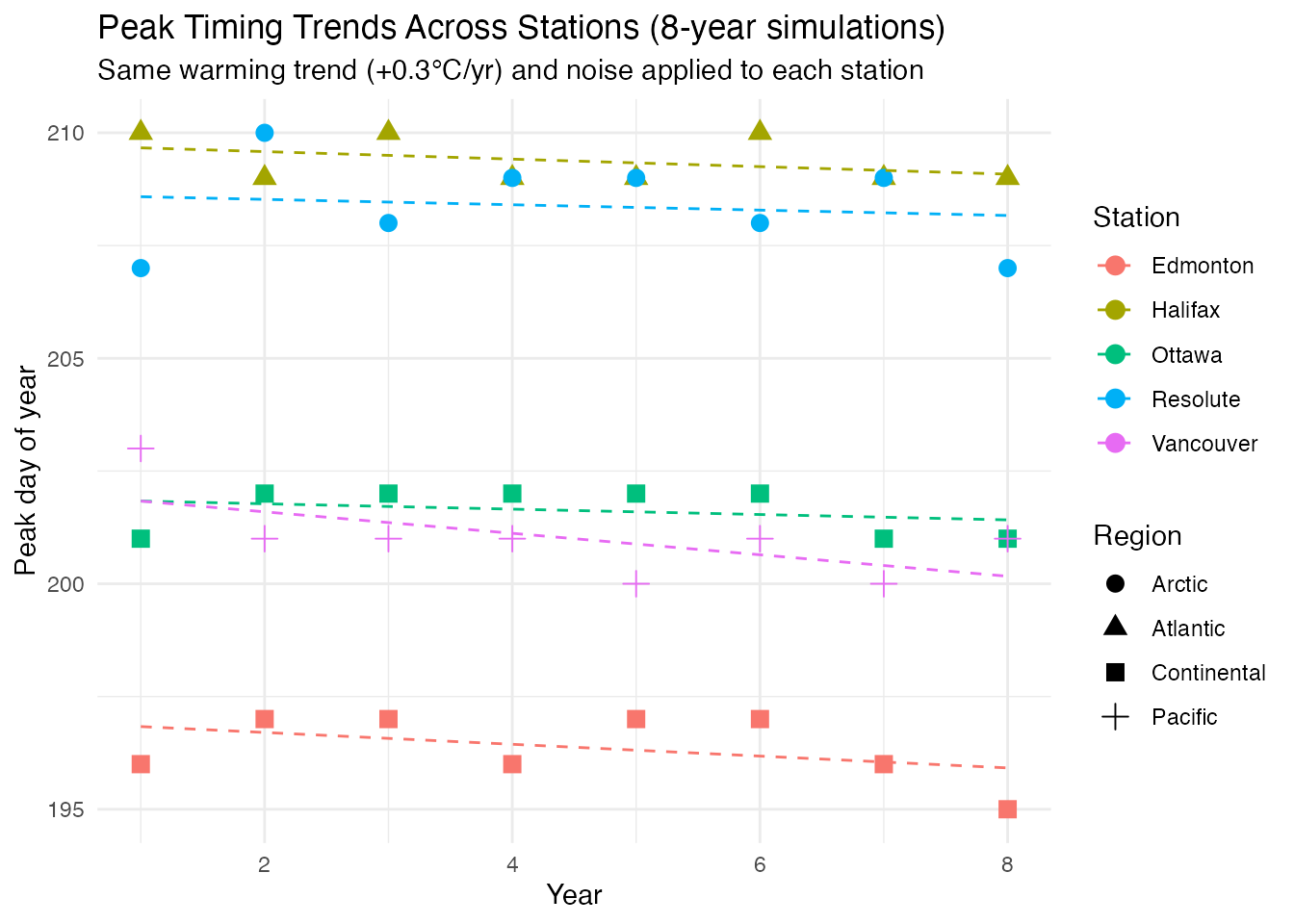 #> Resolute : -0.06 days/year (sd = 1.1 days)Since all stations share the same warming scenario (+0.3°C/year, +3%/year amplitude), the peak timing trends are primarily driven by weather noise rather than a systematic shift. In a real climate analysis with station-specific trends, regional differences in peak timing drift would reveal differential warming patterns (e.g., Arctic amplification causing earlier peaks at high latitudes).