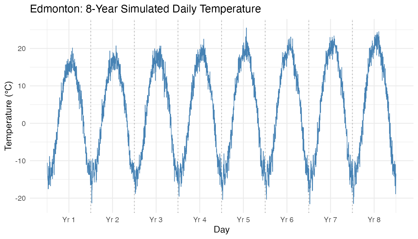 labs(title = "Edmonton: 8-Year Simulated Daily Temperature",