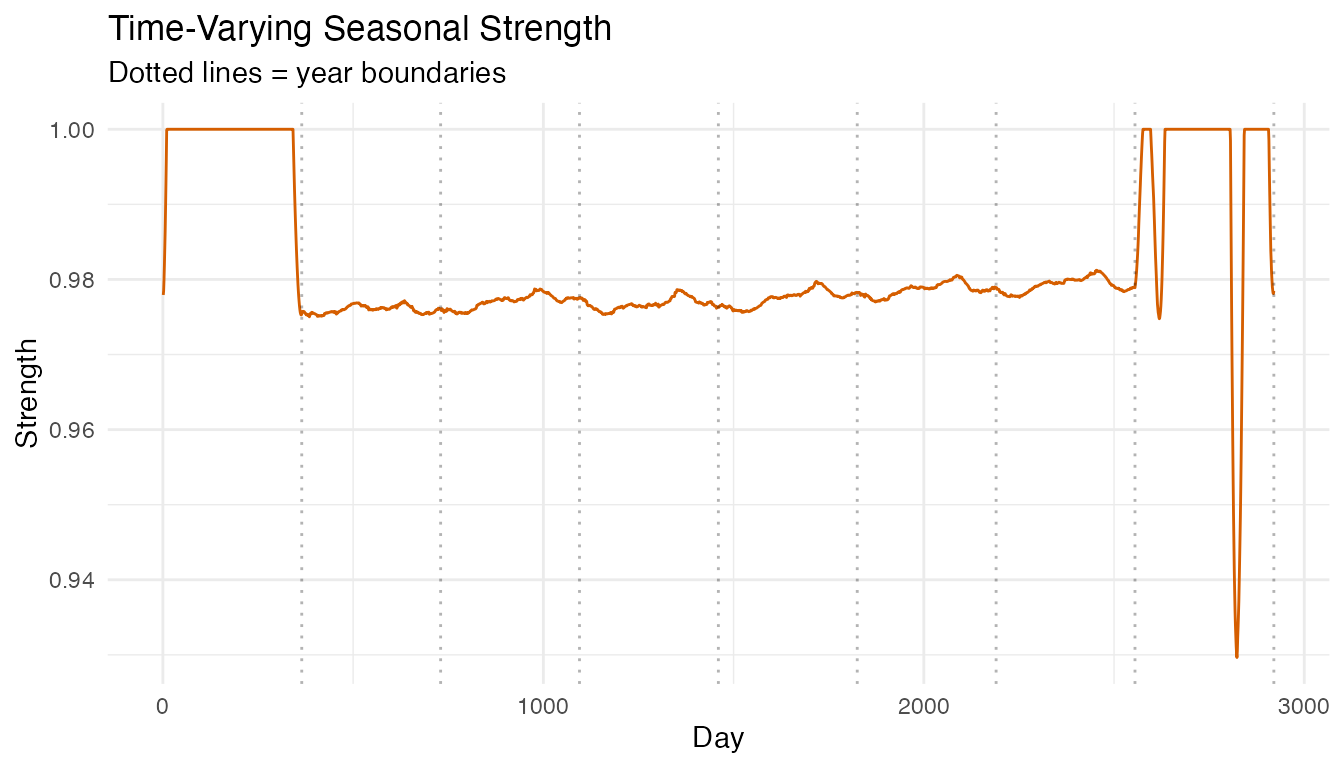- Seasonal strength is high, classified as StableSeasonal — the period is reliable and the seasonal pattern dominates the signal.