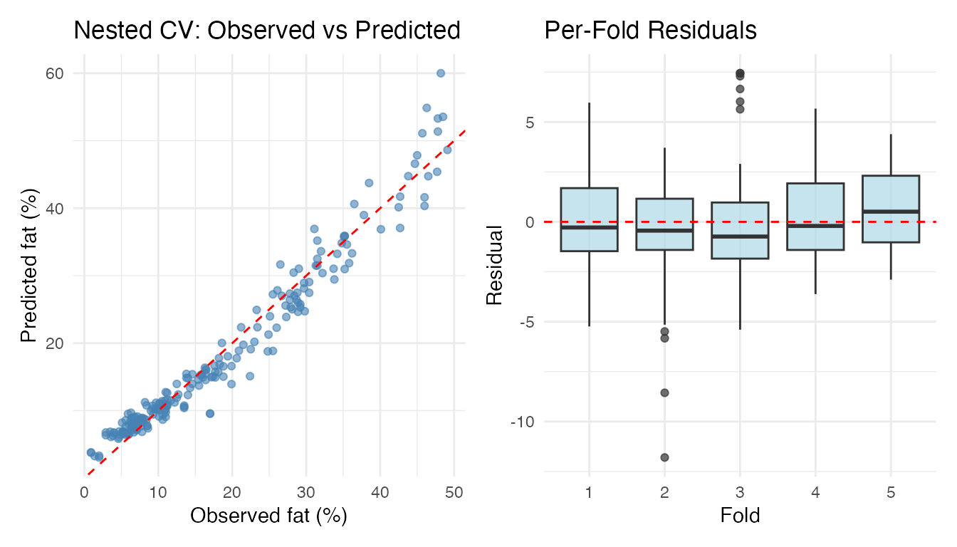 #> Per-fold RMSE range: [2.785, 3.681]Nested Cross-Validation