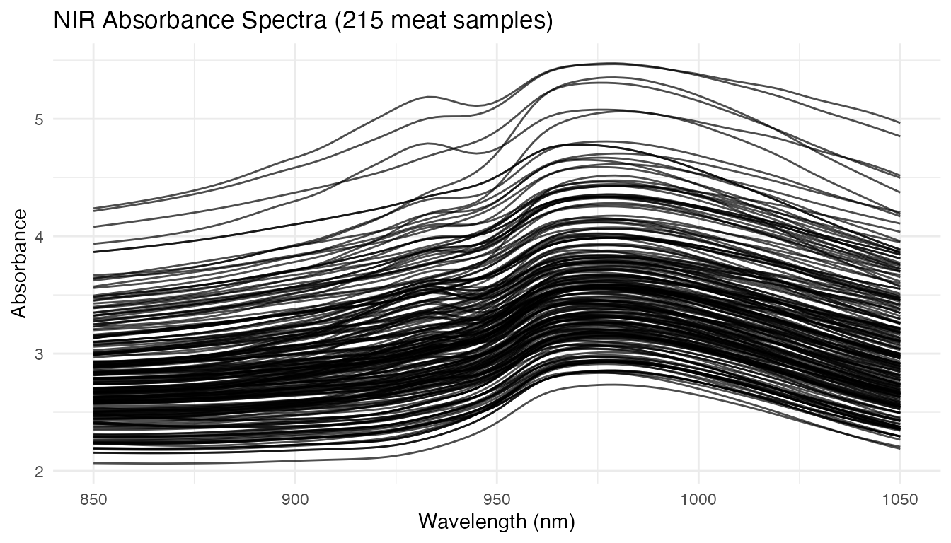 labs(title = "NIR Absorbance Spectra (215 meat samples)",
