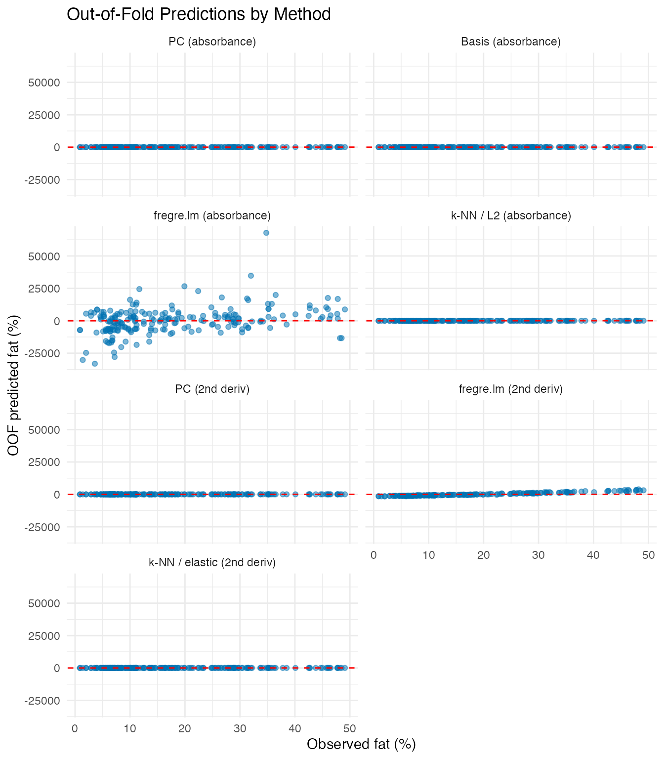x = "Observed fat (%)", y = "OOF predicted fat (%)")