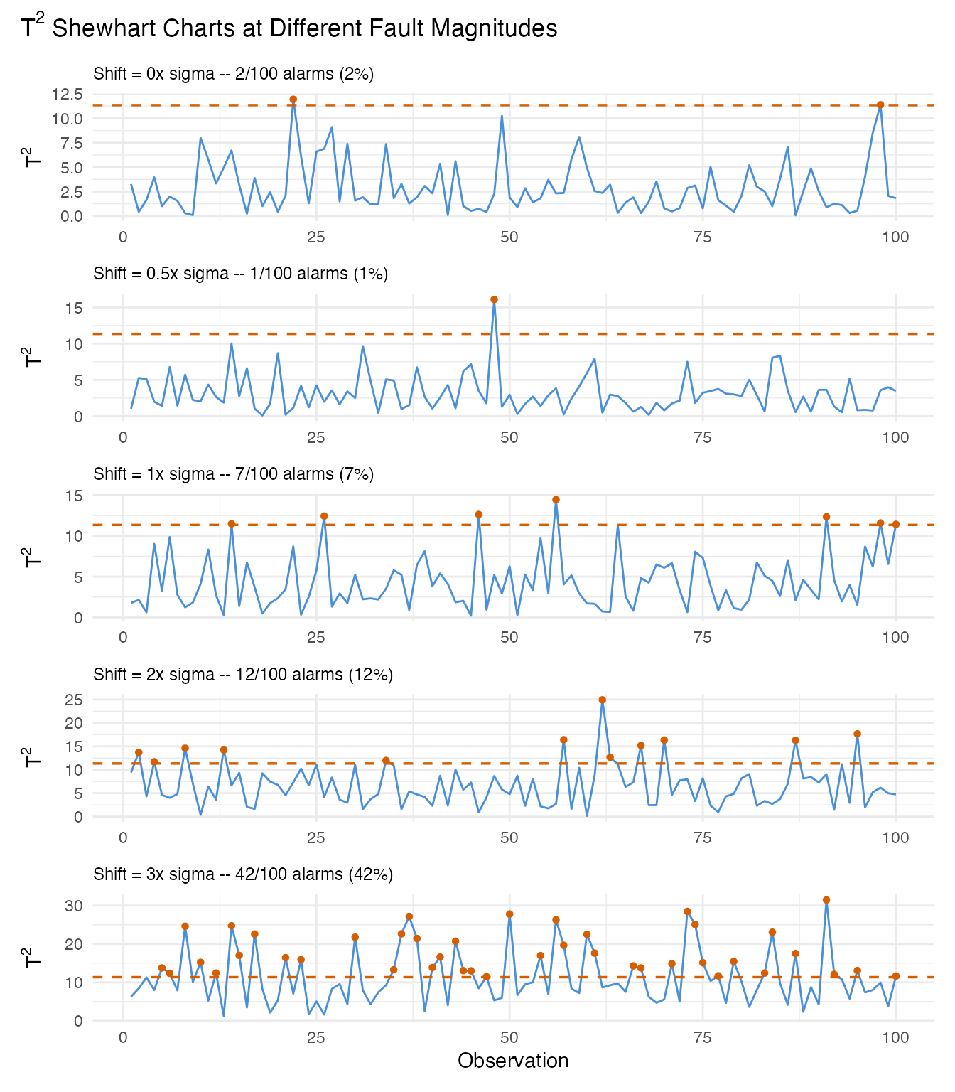 | 5. Detection power | Monitor each fault level with Shewhart, CUSUM, and MEWMA | Detection rate per method and fault strength |