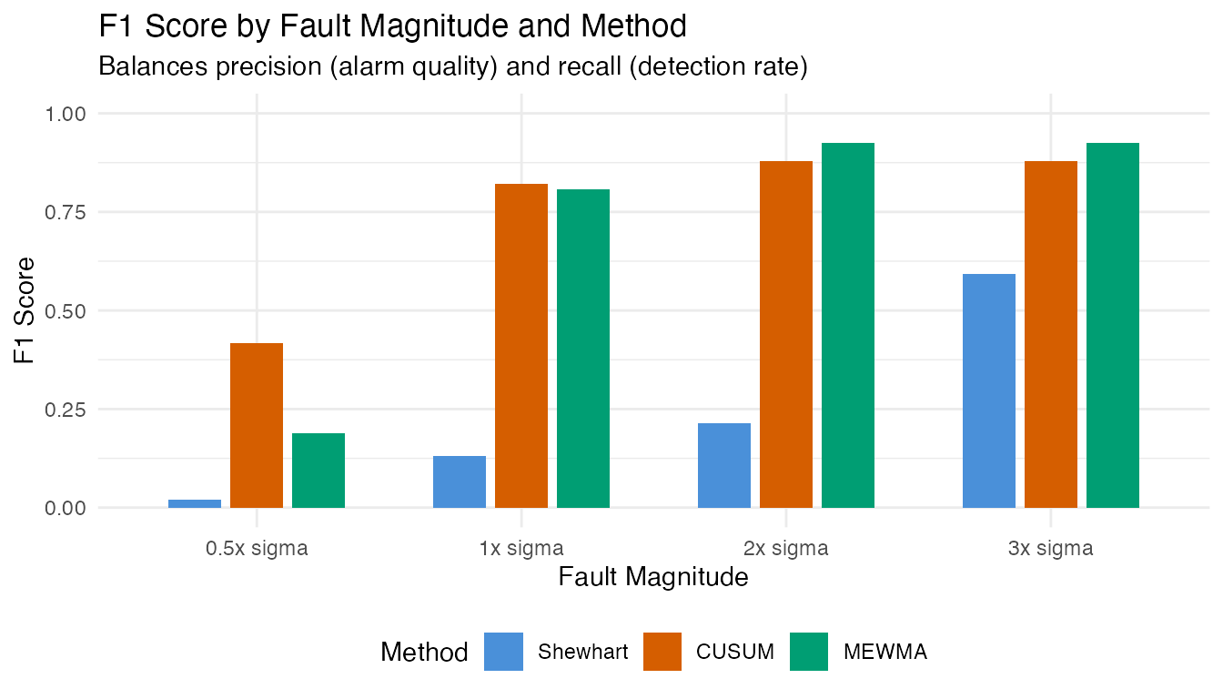 The F1 score reveals the practical trade-off: at small shifts, F1 is low because recall is poor (most faults go undetected). At large shifts, F1 approaches 1.0 as both precision and recall converge to near-perfect values. The crossover point – the shift magnitude where F1 exceeds 0.5 – indicates the minimum fault size the monitoring system handles effectively.