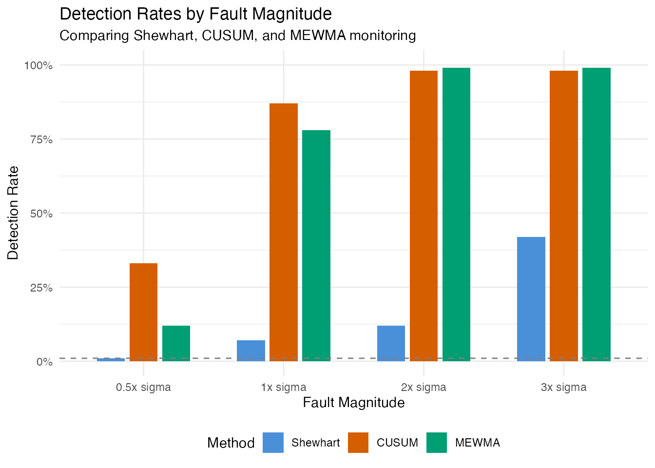 labs(title = "Detection Rates by Fault Magnitude",