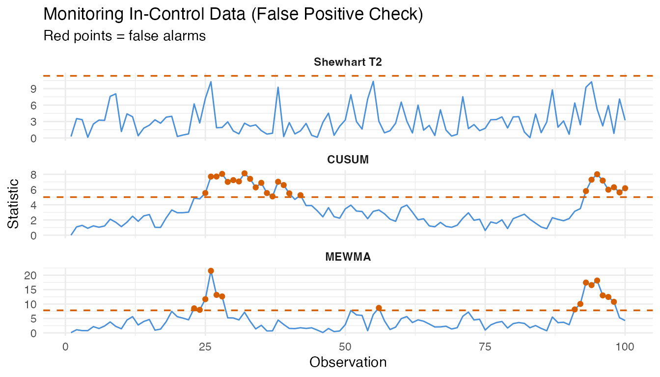 | 3. False positive analysis | Monitor fresh in-control data | Empirical false alarm rate |