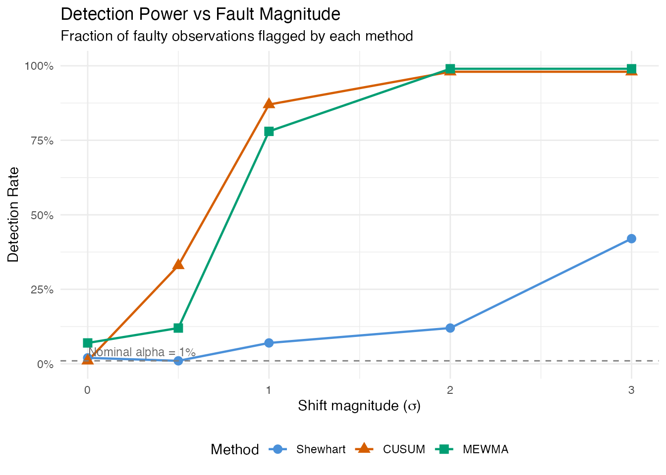 - Detection power: What fraction of truly faulty observations are caught, and how does this depend on fault strength?