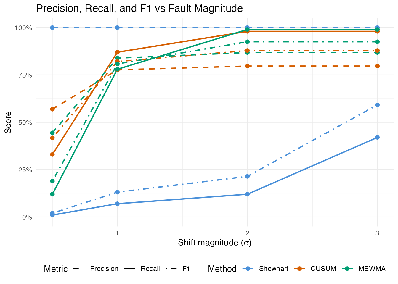 At small shifts (0.5x sigma), precision is typically high (few false alarms relative to the few detections) but recall is low. As the shift grows, recall increases sharply. Precision remains high because the FP count is fixed (determined by the in-control calibration), while TP grows with shift magnitude.