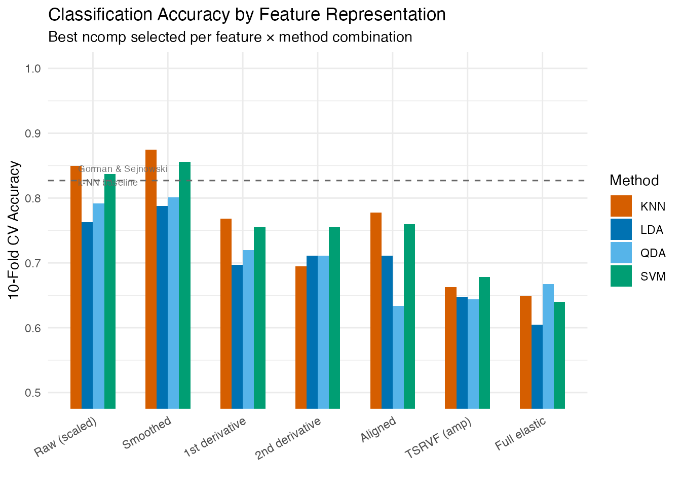 Key finding: The phase/total variance ratio suggests moderate phase variability, but the warping functions reveal this is an artifact — sonar frequency bands are fixed physical measurements without genuine timing shifts. Column standardization + kNN or SVM at 10 FPCs achieves ~87% CV accuracy, matching the original neural network benchmark. The elastic pipeline drops to ~66%, demonstrating that elastic alignment can degrade performance on phase-rigid data.