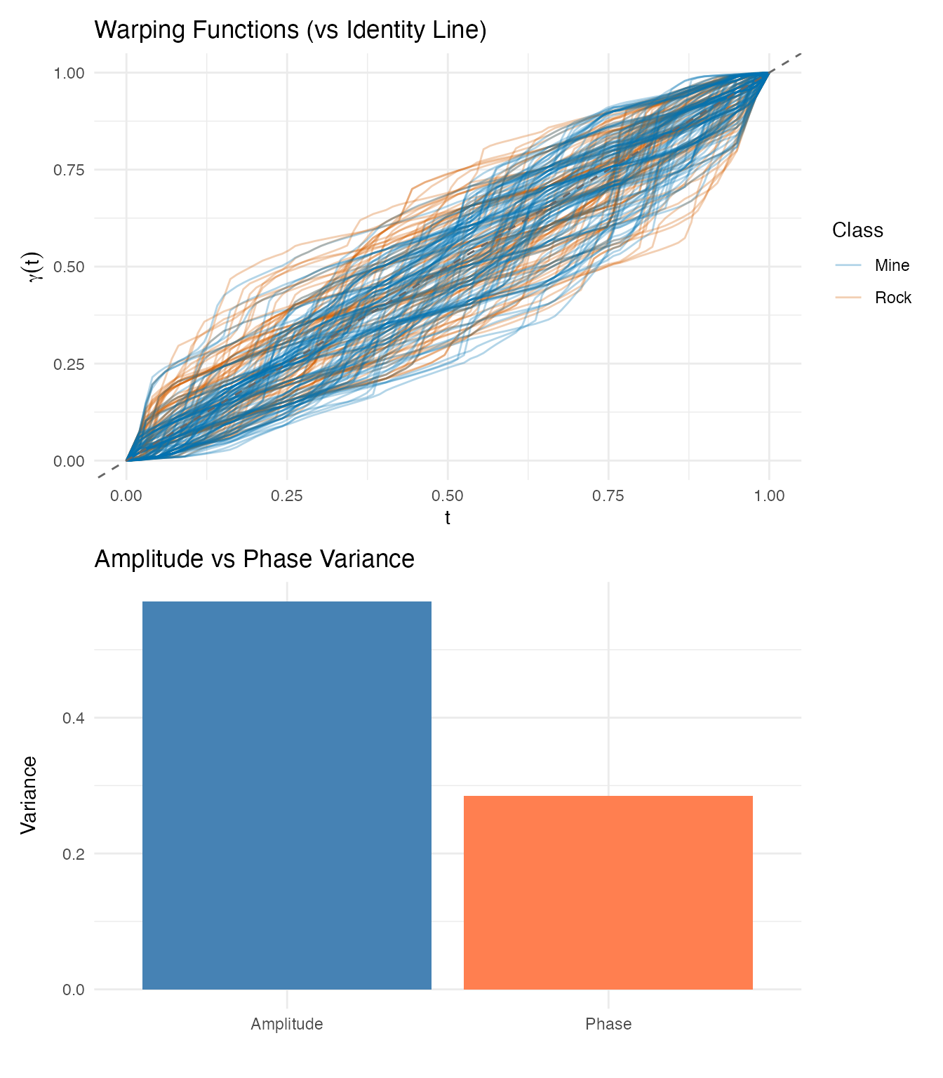 Interpretation: The phase/total variance ratio is 0.33. While this might seem to suggest moderate phase variability, the warping functions tell a different story. Sonar frequency bands are fixed physical measurements — band 10 always measures the same frequency range. When the alignment algorithm “warps” these bands, it is not correcting meaningful timing variation; it is distorting the physical meaning of the frequency axis.