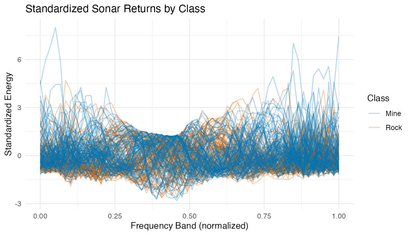The Sonar dataset contains 208 observations: 111 mines (M) and 97 rocks (R). Each has 60 frequency-band energy measurements. We standardize each frequency band to unit variance — critical because band energy scales vary by an order of magnitude across the spectrum.