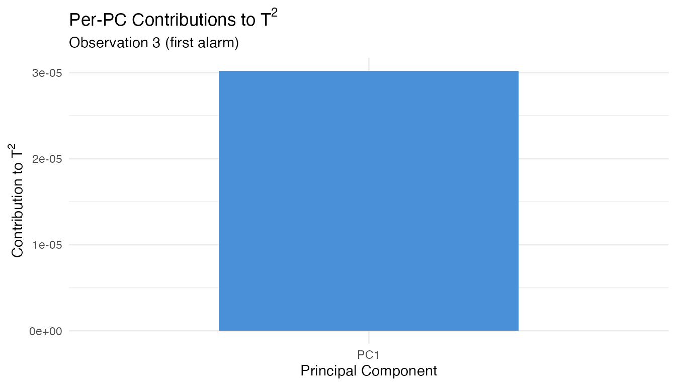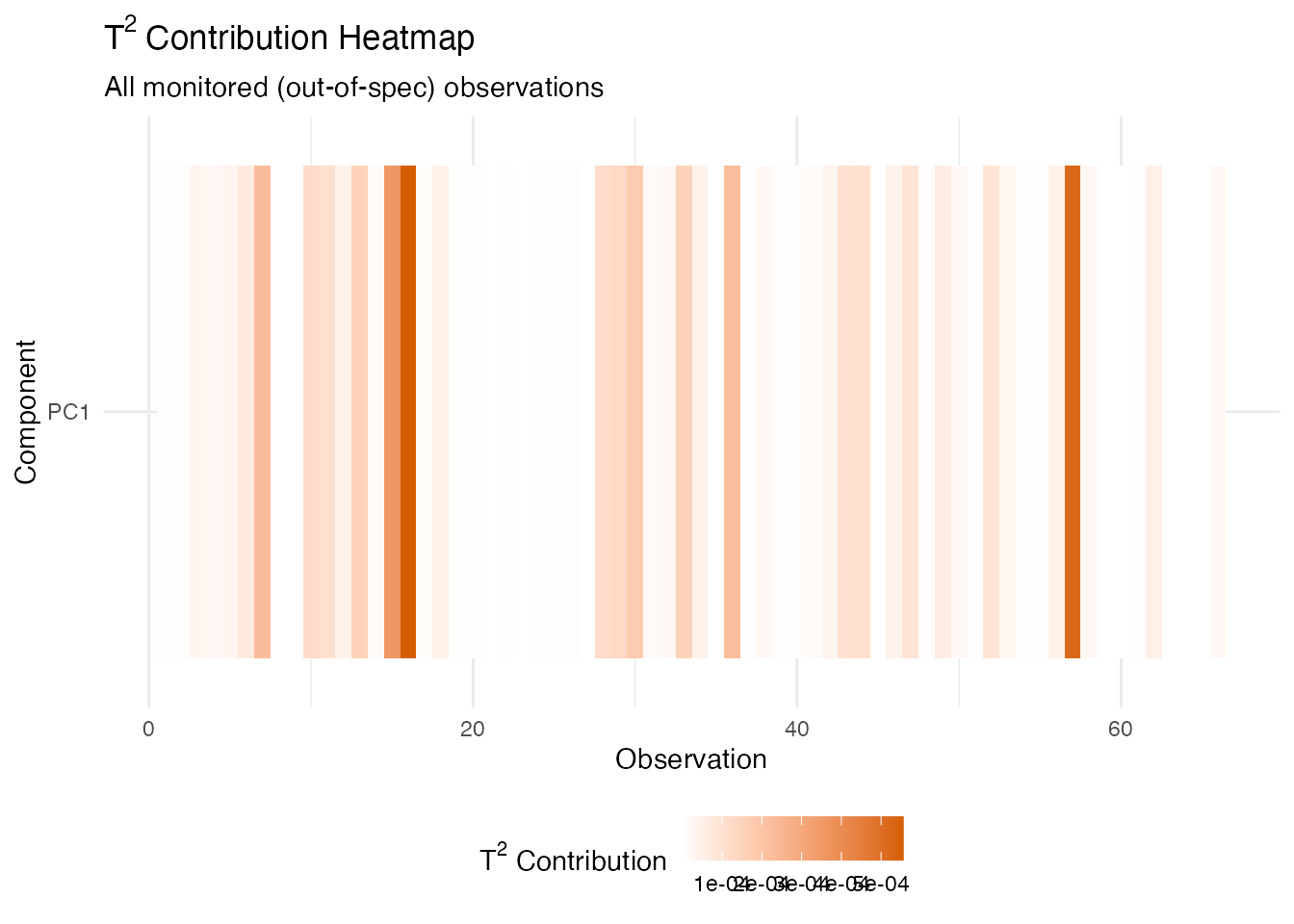 When an alarm fires, the next question is: which part of the spectrum drove it? Per-PC contributions decompose the T-squared statistic into additive terms, one per principal component. A large contribution from PC k means the spectrum’s projection onto eigenfunction k is unusually far from the in-control mean.