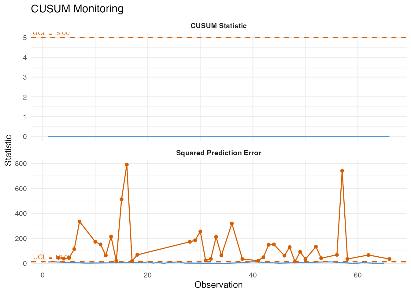 | 6. CUSUM monitoring | Accumulate evidence of persistent shifts | Early detection of sustained deviations |